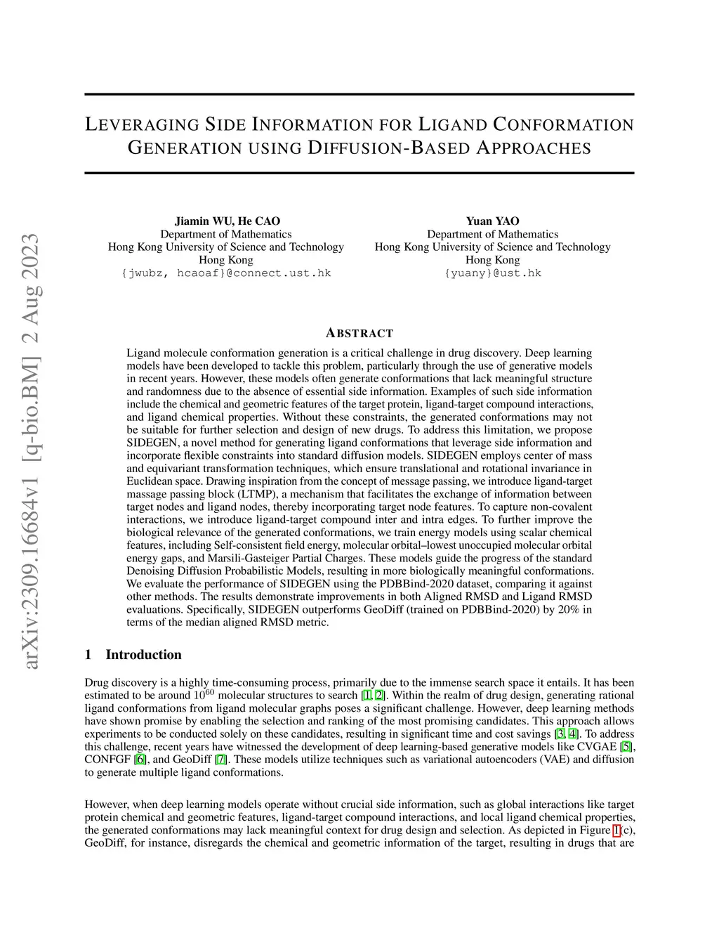 Ligand molecule conformation generation is a critical challenge in drug discovery. Deep learning models have been developed to tackle this problem, particularly through the use of generative models in recent years. However, these models often generate conformations that lack meaningful structure and randomness due to the absence of essential side information. Examples of such side information include the chemical and geometric features of the target protein, ligand-target compound interactions, and ligand chemical properties. Without these constraints, the generated conformations may not be suitable for further selection and design of new drugs. To address this limitation, we propose a novel method for generating ligand conformations that leverage side information and incorporate flexible constraints into standard diffusion models. Drawing inspiration from the concept of message passing, we introduce ligand-target massage passing block, a mechanism that facilitates the exchange of information between target nodes and ligand nodes, thereby incorporating target node features. To capture non-covalent interactions, we introduce ligand-target compound inter and intra edges. To further improve the biological relevance of the generated conformations, we train energy models using scalar chemical features. These models guide the progress of the standard Denoising Diffusion Probabilistic Models, resulting in more biologically meaningful conformations. We evaluate the performance of SIDEGEN using the PDBBind-2020 dataset, comparing it against other methods. The results demonstrate improvements in both Aligned RMSD and Ligand RMSD evaluations. Specifically, our model outperforms GeoDiff (trained on PDBBind-2020) by 20% in terms of the median aligned RMSD metric.
