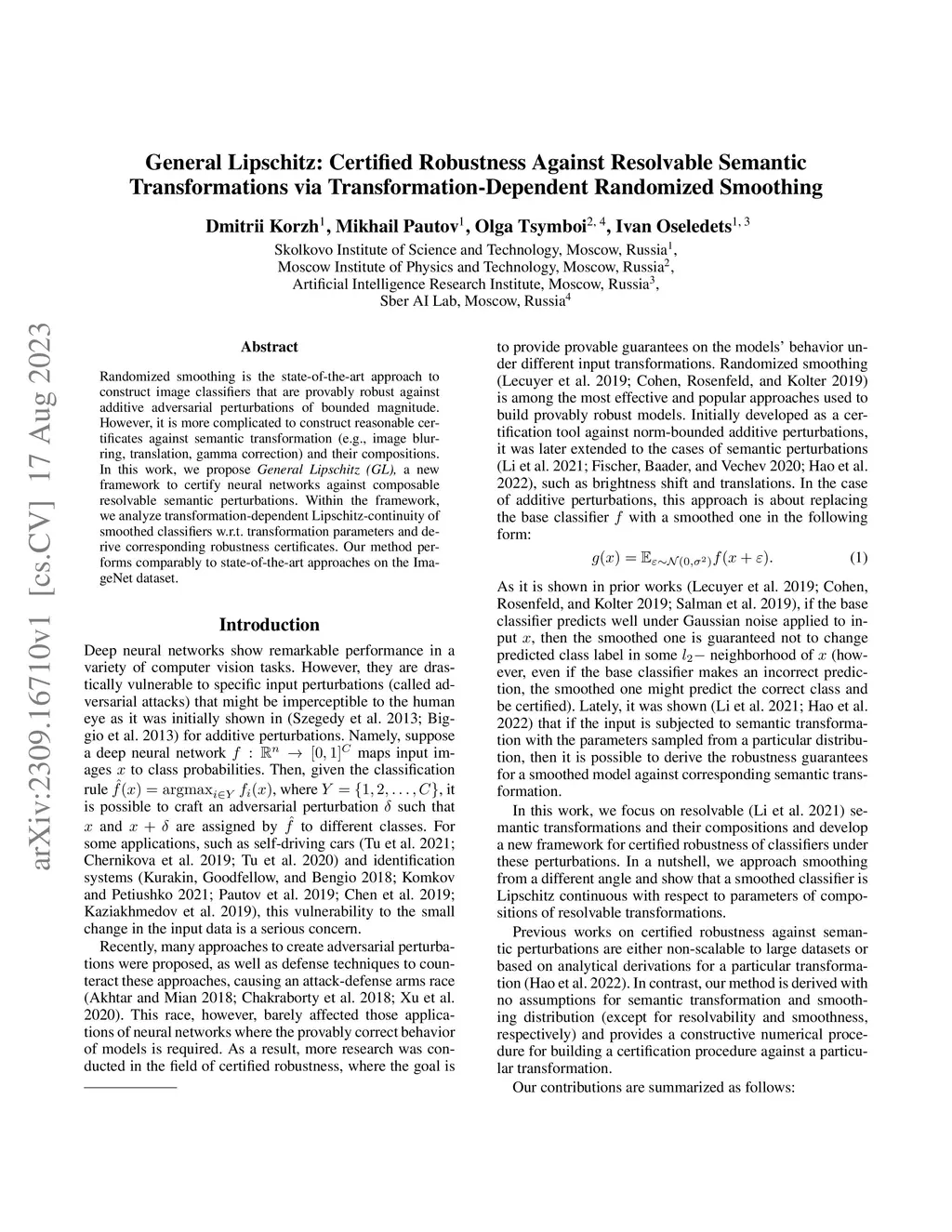 Randomized smoothing is the state-of-the-art approach to construct image classifiers that are provably robust against additive adversarial perturbations of bounded magnitude. However, it is more complicated to construct reasonable certificates against semantic transformation (e.g., image blurring, translation, gamma correction) and their compositions. In this work, we propose \emph{General Lipschitz (GL),} a new framework to certify neural networks against composable resolvable semantic perturbations. Within the framework, we analyze transformation-dependent Lipschitz-continuity of smoothed classifiers w.r.t. transformation parameters and derive corresponding robustness certificates. Our method performs comparably to state-of-the-art approaches on the ImageNet dataset.