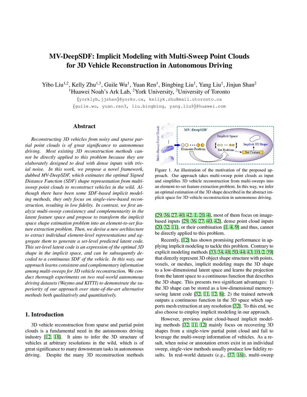 Reconstructing 3D vehicles from noisy and sparse partial point clouds is of great significance to autonomous driving. Most existing 3D reconstruction methods cannot be directly applied to this problem because they are elaborately designed to deal with dense inputs with trivial noise. In this work, we propose a novel framework, dubbed MV-DeepSDF, which estimates the optimal Signed Distance Function (SDF) shape representation from multi-sweep point clouds to reconstruct vehicles in the wild. Although there have been some SDF-based implicit modeling methods, they only focus on single-view-based reconstruction, resulting in low fidelity. In contrast, we first analyze multi-sweep consistency and complementarity in the latent feature space and propose to transform the implicit space shape estimation problem into an element-to-set feature extraction problem. Then, we devise a new architecture to extract individual element-level representations and aggregate them to generate a set-level predicted latent code. This set-level latent code is an expression of the optimal 3D shape in the implicit space, and can be subsequently decoded to a continuous SDF of the vehicle. In this way, our approach learns consistent and complementary information among multi-sweeps for 3D vehicle reconstruction. We conduct thorough experiments on two real-world autonomous driving datasets (Waymo and KITTI) to demonstrate the superiority of our approach over state-of-the-art alternative methods both qualitatively and quantitatively.