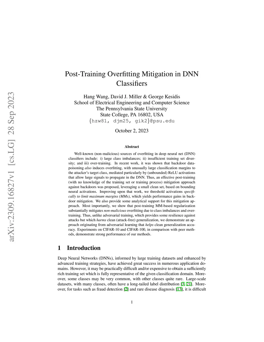 Well-known (non-malicious) sources of overfitting in deep neural net (DNN) classifiers include: i) large class imbalances; ii) insufficient training-set diversity; and iii) over-training. In recent work, it was shown that backdoor data-poisoning also induces overfitting, with unusually large classification margins to the attacker's target class, mediated particularly by (unbounded) ReLU activations that allow large signals to propagate in the DNN. Thus, an effective post-training (with no knowledge of the training set or training process) mitigation approach against backdoors was proposed, leveraging a small clean dataset, based on bounding neural activations. Improving upon that work, we threshold activations specifically to limit maximum margins (MMs), which yields performance gains in backdoor mitigation. We also provide some analytical support for this mitigation approach. Most importantly, we show that post-training MM-based regularization substantially mitigates non-malicious overfitting due to class imbalances and overtraining. Thus, unlike adversarial training, which provides some resilience against attacks but which harms clean (attack-free) generalization, we demonstrate an approach originating from adversarial learning that helps clean generalization accuracy. Experiments on CIFAR-10 and CIFAR-100, in comparison with peer methods, demonstrate strong performance of our methods.