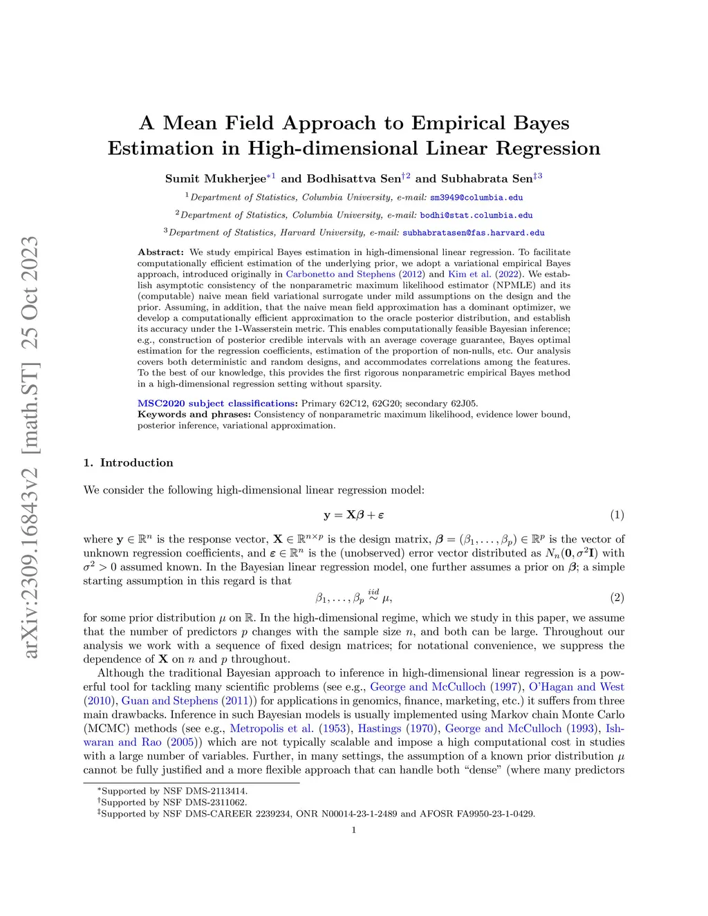 We study empirical Bayes estimation in high-dimensional linear regression. To facilitate computationally efficient estimation of the underlying prior, we adopt a variational empirical Bayes approach, introduced originally in Carbonetto and Stephens (2012) and Kim et al. (2022). We establish asymptotic consistency of the nonparametric maximum likelihood estimator (NPMLE) and its (computable) naive mean field variational surrogate under mild assumptions on the design and the prior. Assuming, in addition, that the naive mean field approximation has a dominant optimizer, we develop a computationally efficient approximation to the oracle posterior distribution, and establish its accuracy under the 1-Wasserstein metric. This enables computationally feasible Bayesian inference; e.g., construction of posterior credible intervals with an average coverage guarantee, Bayes optimal estimation for the regression coefficients, estimation of the proportion of non-nulls, etc. Our analysis covers both deterministic and random designs, and accommodates correlations among the features. To the best of our knowledge, this provides the first rigorous nonparametric empirical Bayes method in a high-dimensional regression setting without sparsity.