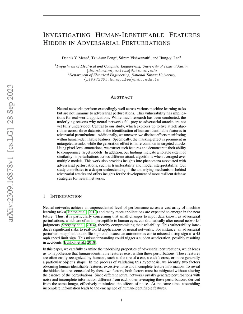 Neural networks perform exceedingly well across various machine learning tasks but are not immune to adversarial perturbations. This vulnerability has implications for real-world applications. While much research has been conducted, the underlying reasons why neural networks fall prey to adversarial attacks are not yet fully understood. Central to our study, which explores up to five attack algorithms across three datasets, is the identification of human-identifiable features in adversarial perturbations. Additionally, we uncover two distinct effects manifesting within human-identifiable features. Specifically, the masking effect is prominent in untargeted attacks, while the generation effect is more common in targeted attacks. Using pixel-level annotations, we extract such features and demonstrate their ability to compromise target models. In addition, our findings indicate a notable extent of similarity in perturbations across different attack algorithms when averaged over multiple models. This work also provides insights into phenomena associated with adversarial perturbations, such as transferability and model interpretability. Our study contributes to a deeper understanding of the underlying mechanisms behind adversarial attacks and offers insights for the development of more resilient defense strategies for neural networks.