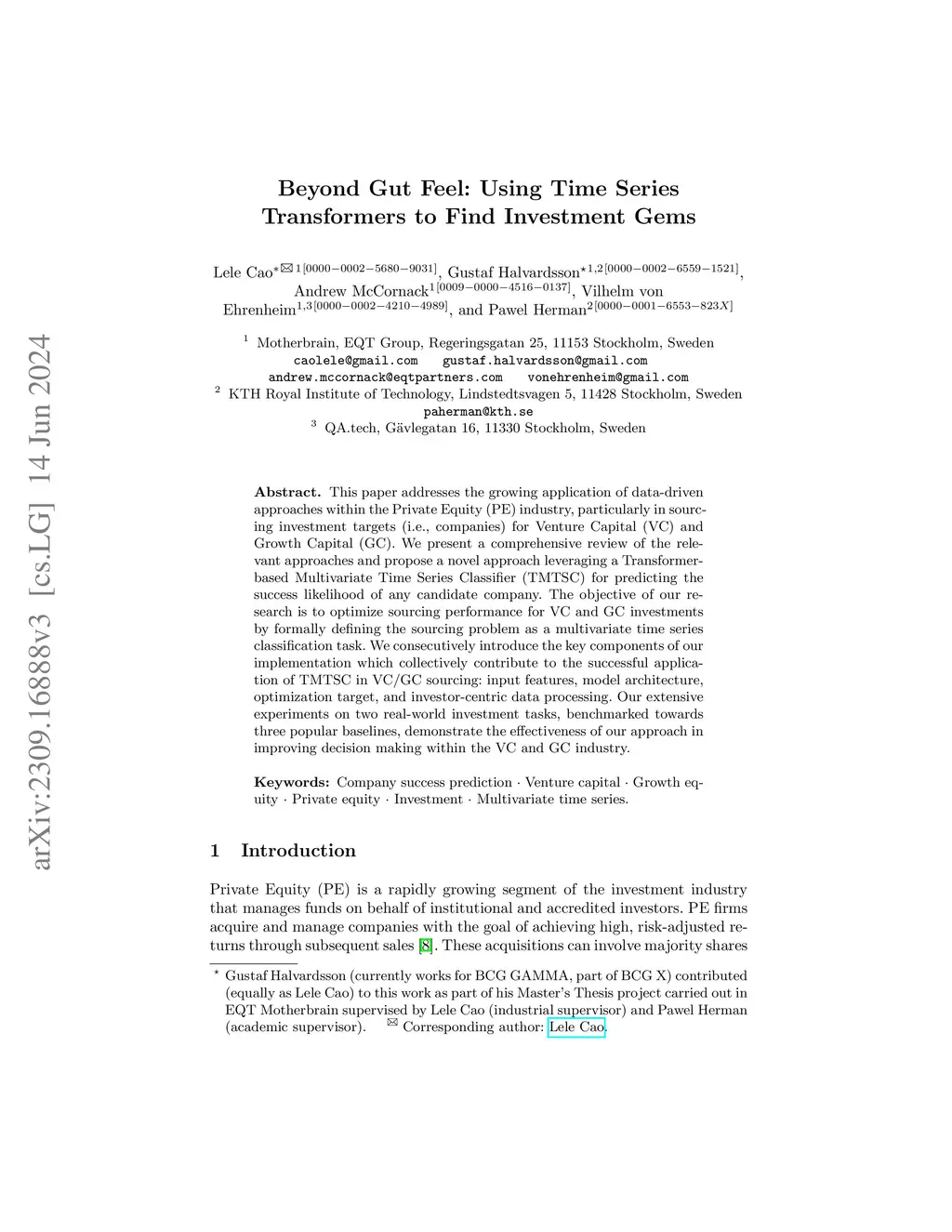 This paper addresses the growing application of data-driven approaches within the Private Equity (PE) industry, particularly in sourcing investment targets (i.e., companies) for Venture Capital (VC) and Growth Capital (GC). We present a comprehensive review of the relevant approaches and propose a novel approach leveraging a Transformer-based Multivariate Time Series Classifier (TMTSC) for predicting the success likelihood of any candidate company. The objective of our research is to optimize sourcing performance for VC and GC investments by formally defining the sourcing problem as a multivariate time series classification task. We consecutively introduce the key components of our implementation which collectively contribute to the successful application of TMTSC in VC/GC sourcing: input features, model architecture, optimization target, and investor-centric data processing. Our extensive experiments on two real-world investment tasks, benchmarked towards three popular baselines, demonstrate the effectiveness of our approach in improving decision making within the VC and GC industry.