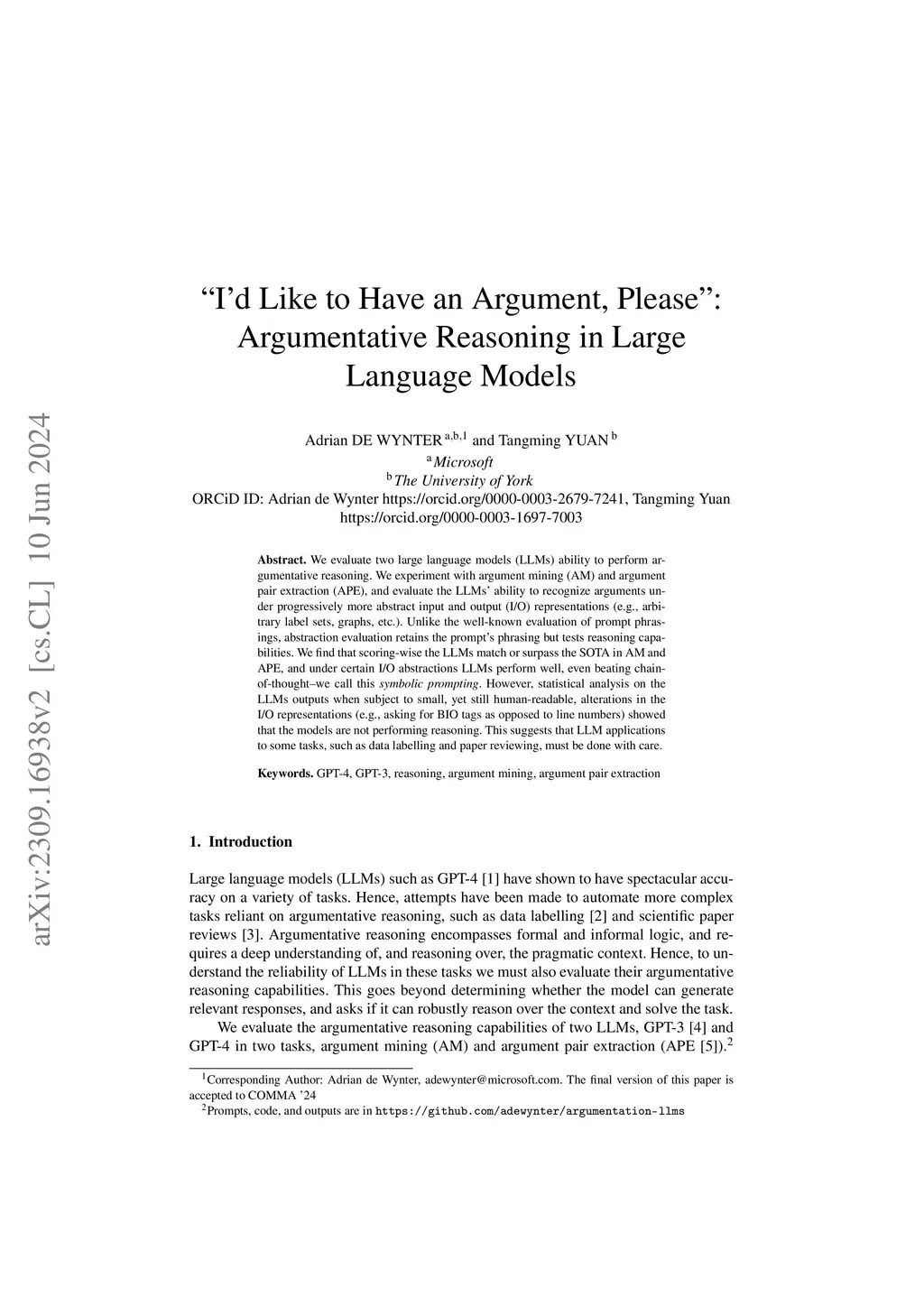 We evaluate two large language models (LLMs) ability to perform argumentative reasoning. We experiment with argument mining (AM) and argument pair extraction (APE), and evaluate the LLMs' ability to recognize arguments under progressively more abstract input and output (I/O) representations (e.g., arbitrary label sets, graphs, etc.). Unlike the well-known evaluation of prompt phrasings, abstraction evaluation retains the prompt's phrasing but tests reasoning capabilities. We find that scoring-wise the LLMs match or surpass the SOTA in AM and APE, and under certain I/O abstractions LLMs perform well, even beating chain-of-thought--we call this symbolic prompting. However, statistical analysis on the LLMs outputs when subject to small, yet still human-readable, alterations in the I/O representations (e.g., asking for BIO tags as opposed to line numbers) showed that the models are not performing reasoning. This suggests that LLM applications to some tasks, such as data labelling and paper reviewing, must be done with care.