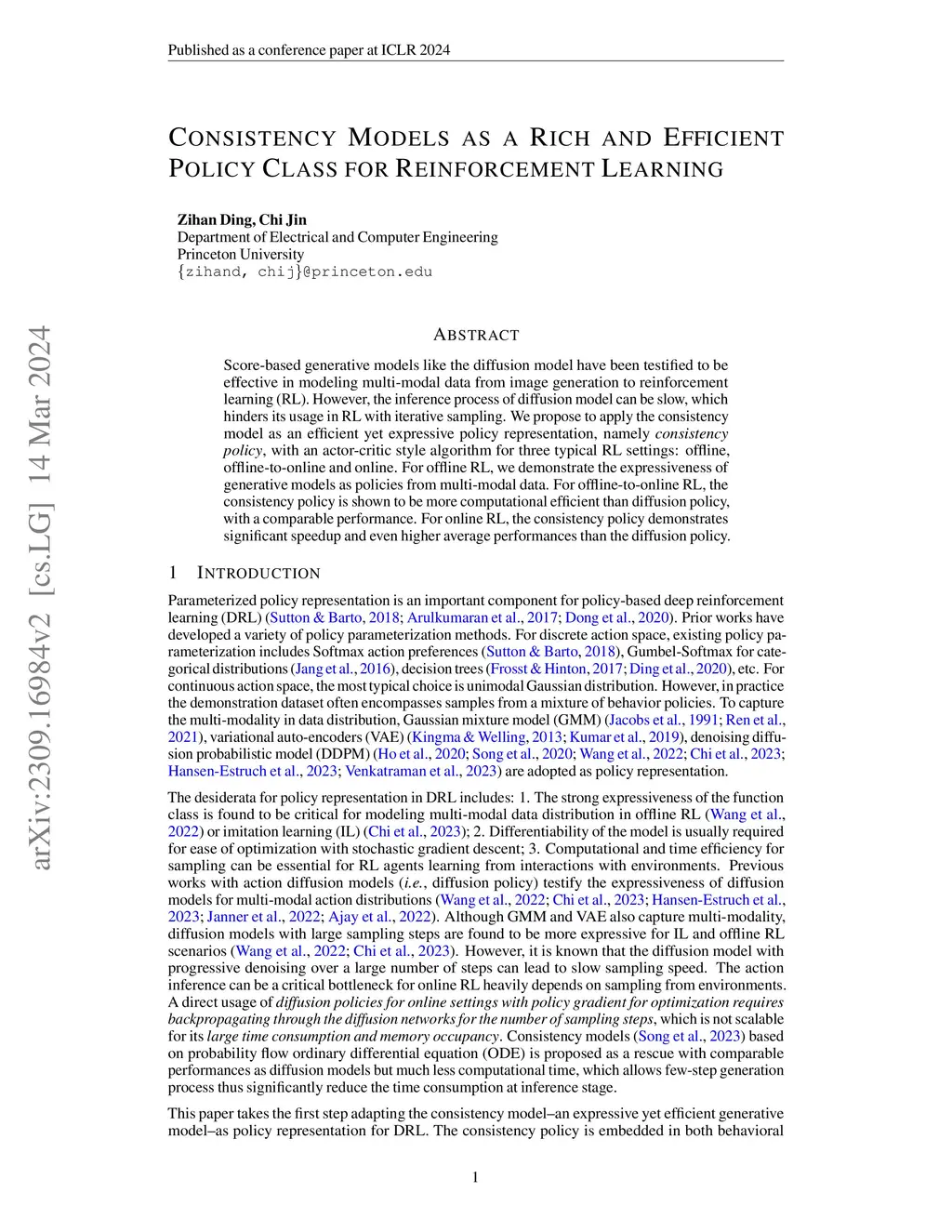 Score-based generative models like the diffusion model have been testified to be effective in modeling multi-modal data from image generation to reinforcement learning (RL). However, the inference process of diffusion model can be slow, which hinders its usage in RL with iterative sampling. We propose to apply the consistency model as an efficient yet expressive policy representation, namely consistency policy, with an actor-critic style algorithm for three typical RL settings: offline, offline-to-online and online. For offline RL, we demonstrate the expressiveness of generative models as policies from multi-modal data. For offline-to-online RL, the consistency policy is shown to be more computational efficient than diffusion policy, with a comparable performance. For online RL, the consistency policy demonstrates significant speedup and even higher average performances than the diffusion policy.