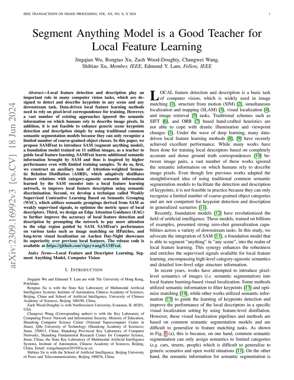 Local feature detection and description play an important role in many computer vision tasks, which are designed to detect and describe keypoints in "any scene" and "any downstream task". Data-driven local feature learning methods need to rely on pixel-level correspondence for training, which is challenging to acquire at scale, thus hindering further improvements in performance. In this paper, we propose SAMFeat to introduce SAM (segment anything model), a fundamental model trained on 11 million images, as a teacher to guide local feature learning and thus inspire higher performance on limited datasets. To do so, first, we construct an auxiliary task of Pixel Semantic Relational Distillation (PSRD), which distillates feature relations with category-agnostic semantic information learned by the SAM encoder into a local feature learning network, to improve local feature description using semantic discrimination. Second, we develop a technique called Weakly Supervised Contrastive Learning Based on Semantic Grouping (WSC), which utilizes semantic groupings derived from SAM as weakly supervised signals, to optimize the metric space of local descriptors. Third, we design an Edge Attention Guidance (EAG) to further improve the accuracy of local feature detection and description by prompting the network to pay more attention to the edge region guided by SAM. SAMFeat's performance on various tasks such as image matching on HPatches, and long-term visual localization on Aachen Day-Night showcases its superiority over previous local features. The release code is available at https://github.com/vignywang/SAMFeat.
