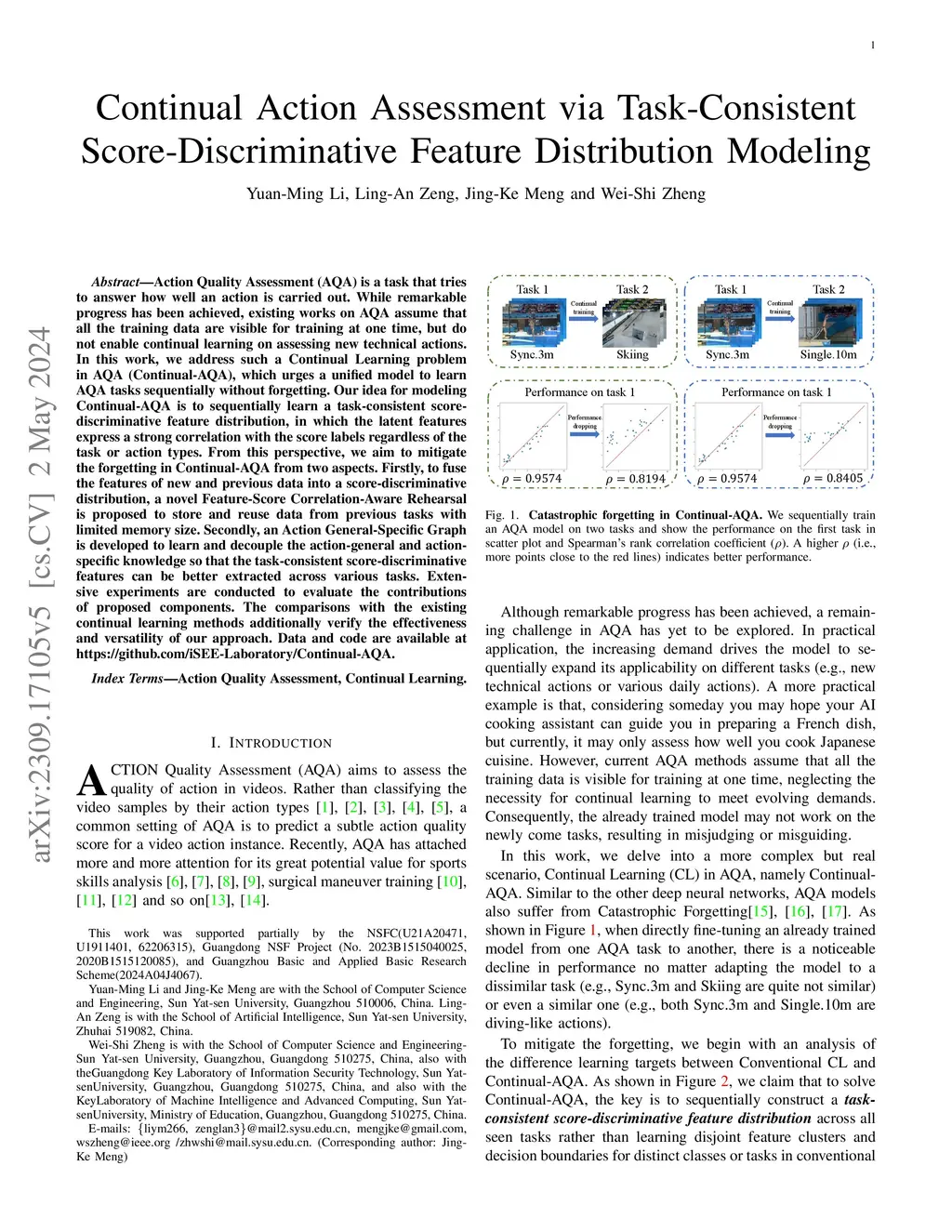 Action Quality Assessment (AQA) is a task that tries to answer how well an action is carried out. While remarkable progress has been achieved, existing works on AQA assume that all the training data are visible for training at one time, but do not enable continual learning on assessing new technical actions. In this work, we address such a Continual Learning problem in AQA (Continual-AQA), which urges a unified model to learn AQA tasks sequentially without forgetting. Our idea for modeling Continual-AQA is to sequentially learn a task-consistent score-discriminative feature distribution, in which the latent features express a strong correlation with the score labels regardless of the task or action types.From this perspective, we aim to mitigate the forgetting in Continual-AQA from two aspects. Firstly, to fuse the features of new and previous data into a score-discriminative distribution, a novel Feature-Score Correlation-Aware Rehearsal is proposed to store and reuse data from previous tasks with limited memory size. Secondly, an Action General-Specific Graph is developed to learn and decouple the action-general and action-specific knowledge so that the task-consistent score-discriminative features can be better extracted across various tasks. Extensive experiments are conducted to evaluate the contributions of proposed components. The comparisons with the existing continual learning methods additionally verify the effectiveness and versatility of our approach. Data and code are available at https://github.com/iSEE-Laboratory/Continual-AQA.