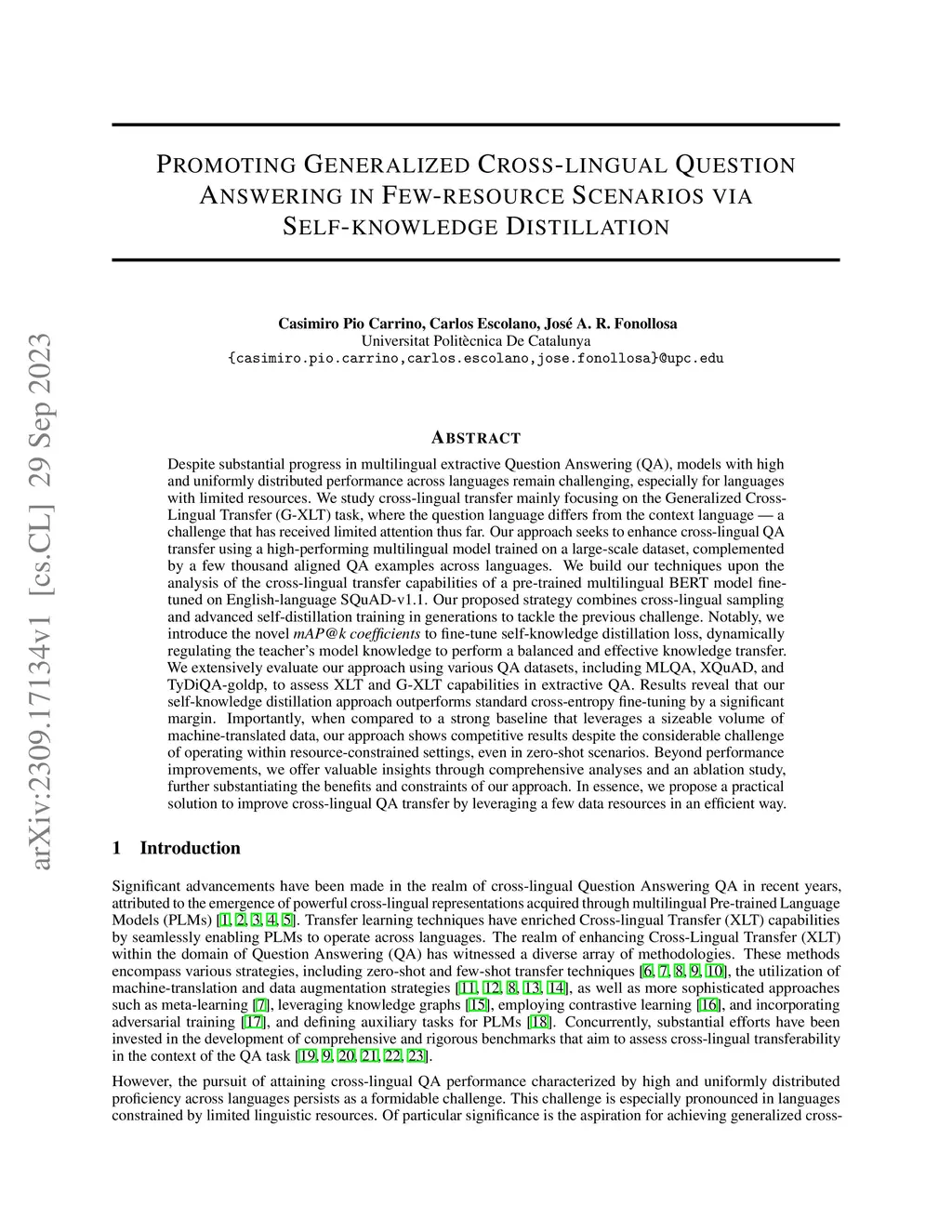 Despite substantial progress in multilingual extractive Question Answering (QA), models with high and uniformly distributed performance across languages remain challenging, especially for languages with limited resources. We study cross-lingual transfer mainly focusing on the Generalized Cross-Lingual Transfer (G-XLT) task, where the question language differs from the context language - a challenge that has received limited attention thus far. Our approach seeks to enhance cross-lingual QA transfer using a high-performing multilingual model trained on a large-scale dataset, complemented by a few thousand aligned QA examples across languages. Our proposed strategy combines cross-lingual sampling and advanced self-distillation training in generations to tackle the previous challenge. Notably, we introduce the novel mAP@k coefficients to fine-tune self-knowledge distillation loss, dynamically regulating the teacher's model knowledge to perform a balanced and effective knowledge transfer. We extensively evaluate our approach to assess XLT and G-XLT capabilities in extractive QA. Results reveal that our self-knowledge distillation approach outperforms standard cross-entropy fine-tuning by a significant margin. Importantly, when compared to a strong baseline that leverages a sizeable volume of machine-translated data, our approach shows competitive results despite the considerable challenge of operating within resource-constrained settings, even in zero-shot scenarios. Beyond performance improvements, we offer valuable insights through comprehensive analyses and an ablation study, further substantiating the benefits and constraints of our approach. In essence, we propose a practical solution to improve cross-lingual QA transfer by leveraging a few data resources in an efficient way.