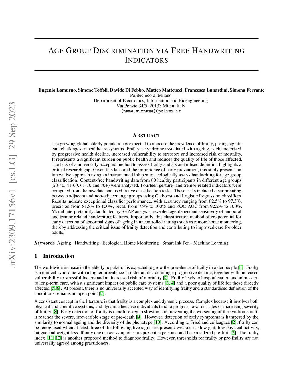 The growing global elderly population is expected to increase the prevalence of frailty, posing significant challenges to healthcare systems. Frailty, a syndrome associated with ageing, is characterised by progressive health decline, increased vulnerability to stressors and increased risk of mortality. It represents a significant burden on public health and reduces the quality of life of those affected. The lack of a universally accepted method to assess frailty and a standardised definition highlights a critical research gap. Given this lack and the importance of early prevention, this study presents an innovative approach using an instrumented ink pen to ecologically assess handwriting for age group classification. Content-free handwriting data from 80 healthy participants in different age groups (20-40, 41-60, 61-70 and 70+) were analysed. Fourteen gesture- and tremor-related indicators were computed from the raw data and used in five classification tasks. These tasks included discriminating between adjacent and non-adjacent age groups using Catboost and Logistic Regression classifiers. Results indicate exceptional classifier performance, with accuracy ranging from 82.5% to 97.5%, precision from 81.8% to 100%, recall from 75% to 100% and ROC-AUC from 92.2% to 100%. Model interpretability, facilitated by SHAP analysis, revealed age-dependent sensitivity of temporal and tremor-related handwriting features. Importantly, this classification method offers potential for early detection of abnormal signs of ageing in uncontrolled settings such as remote home monitoring, thereby addressing the critical issue of frailty detection and contributing to improved care for older adults.