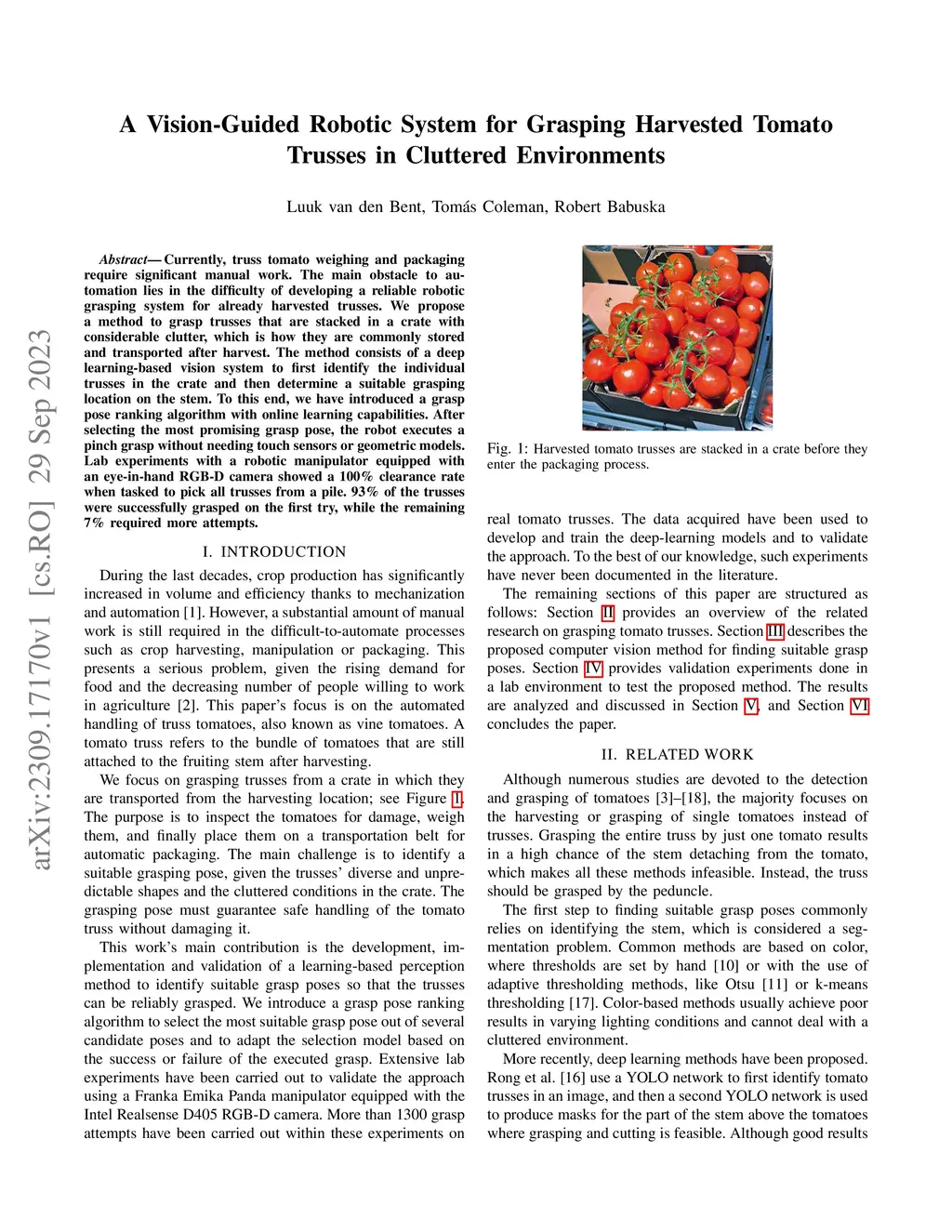 Robotic Grasping of Harvested Tomato Trusses Using Vision and Online Learning