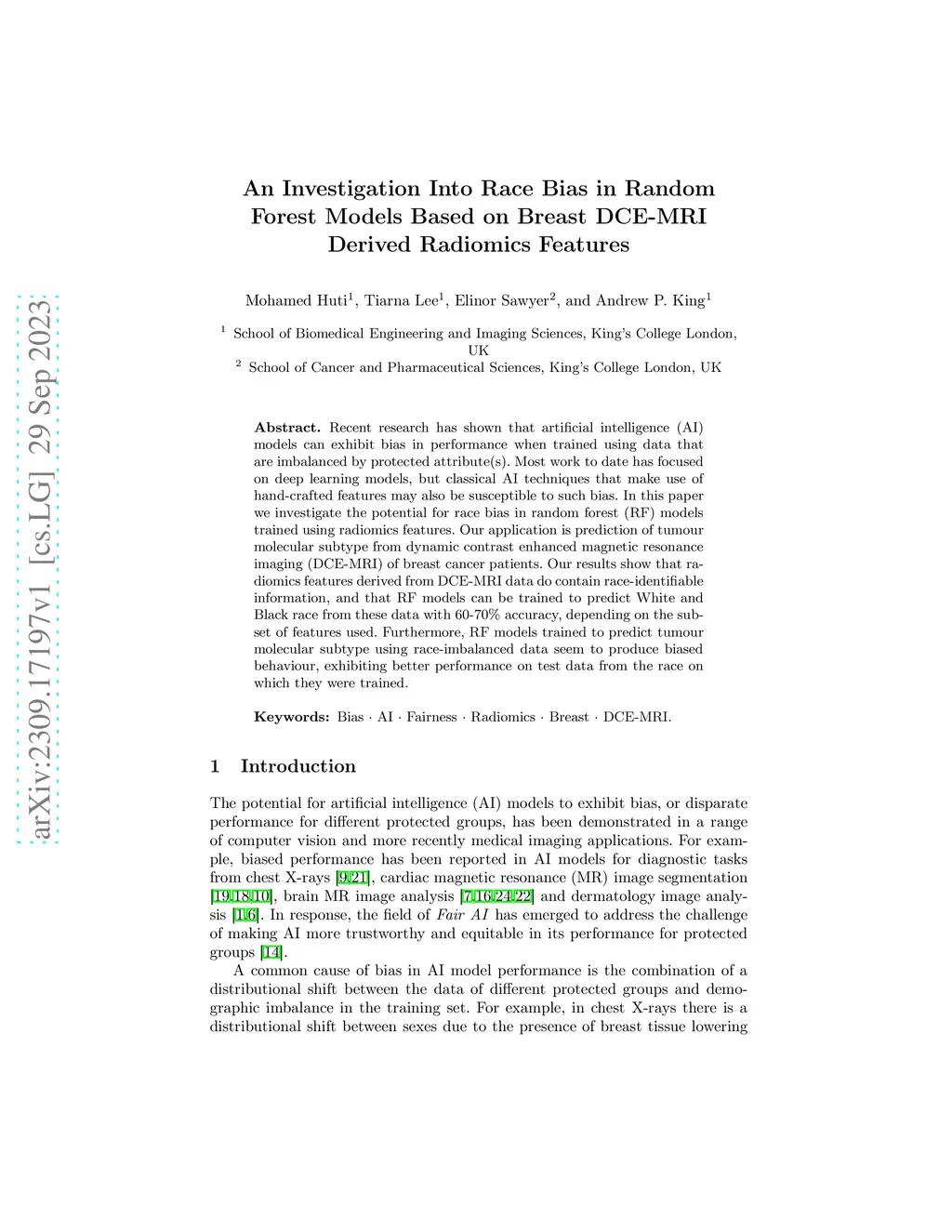 An Investigation Into Race Bias in Random Forest Models Based on Breast