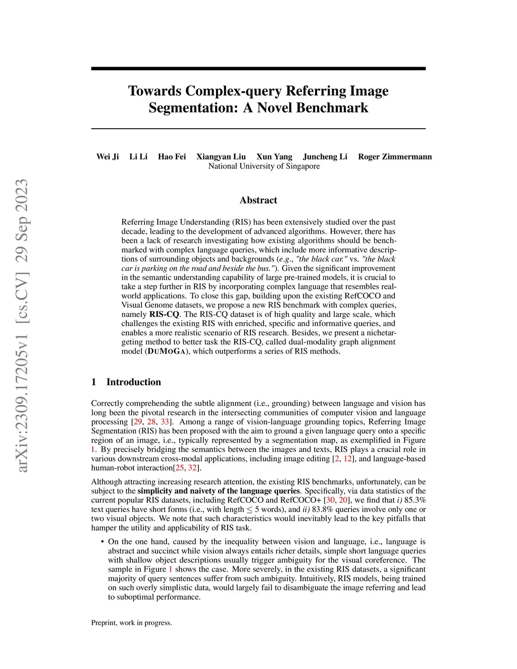 Referring Image Understanding (RIS) has been extensively studied over the past decade, leading to the development of advanced algorithms. However, there has been a lack of research investigating how existing algorithms should be benchmarked with complex language queries, which include more informative descriptions of surrounding objects and backgrounds (\eg \textit{"the black car."} vs. \textit{"the black car is parking on the road and beside the bus."}). Given the significant improvement in the semantic understanding capability of large pre-trained models, it is crucial to take a step further in RIS by incorporating complex language that resembles real-world applications. To close this gap, building upon the existing RefCOCO and Visual Genome datasets, we propose a new RIS benchmark with complex queries, namely \textbf{RIS-CQ}. The RIS-CQ dataset is of high quality and large scale, which challenges the existing RIS with enriched, specific and informative queries, and enables a more realistic scenario of RIS research. Besides, we present a nichetargeting method to better task the RIS-CQ, called dual-modality graph alignment model (\textbf{\textsc{DuMoGa}}), which outperforms a series of RIS methods.
