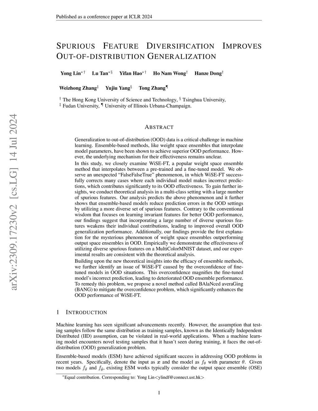 Generalization to out-of-distribution (OOD) data is a critical challenge in machine learning. Ensemble-based methods, like weight space ensembles that interpolate model parameters, have been shown to achieve superior OOD performance. However, the underlying mechanism for their effectiveness remains unclear. In this study, we closely examine WiSE-FT, a popular weight space ensemble method that interpolates between a pre-trained and a fine-tuned model. We observe an unexpected ``FalseFalseTrue" phenomenon, in which WiSE-FT successfully corrects many cases where each individual model makes incorrect predictions, which contributes significantly to its OOD effectiveness. To gain further insights, we conduct theoretical analysis in a multi-class setting with a large number of spurious features. Our analysis predicts the above phenomenon and it further shows that ensemble-based models reduce prediction errors in the OOD settings by utilizing a more diverse set of spurious features. Contrary to the conventional wisdom that focuses on learning invariant features for better OOD performance, our findings suggest that incorporating a large number of diverse spurious features weakens their individual contributions, leading to improved overall OOD generalization performance. Additionally, our findings provide the first explanation for the mysterious phenomenon of weight space ensembles outperforming output space ensembles in OOD. Empirically we demonstrate the effectiveness of utilizing diverse spurious features on a MultiColorMNIST dataset, and our experimental results are consistent with the theoretical analysis. Building upon the new theoretical insights into the efficacy of ensemble methods, we further propose a novel averaging method called BAlaNced averaGing (BANG) which significantly enhances the OOD performance of WiSE-FT.