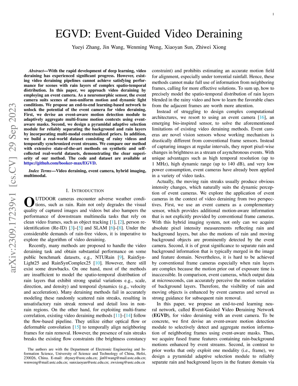 With the rapid development of deep learning, video deraining has experienced significant progress. However, existing video deraining pipelines cannot achieve satisfying performance for scenes with rain layers of complex spatio-temporal distribution. In this paper, we approach video deraining by employing an event camera. As a neuromorphic sensor, the event camera suits scenes of non-uniform motion and dynamic light conditions. We propose an end-to-end learning-based network to unlock the potential of the event camera for video deraining. First, we devise an event-aware motion detection module to adaptively aggregate multi-frame motion contexts using event-aware masks. Second, we design a pyramidal adaptive selection module for reliably separating the background and rain layers by incorporating multi-modal contextualized priors. In addition, we build a real-world dataset consisting of rainy videos and temporally synchronized event streams. We compare our method with extensive state-of-the-art methods on synthetic and self-collected real-world datasets, demonstrating the clear superiority of our method. The code and dataset are available at \url{https://github.com/booker-max/EGVD}.