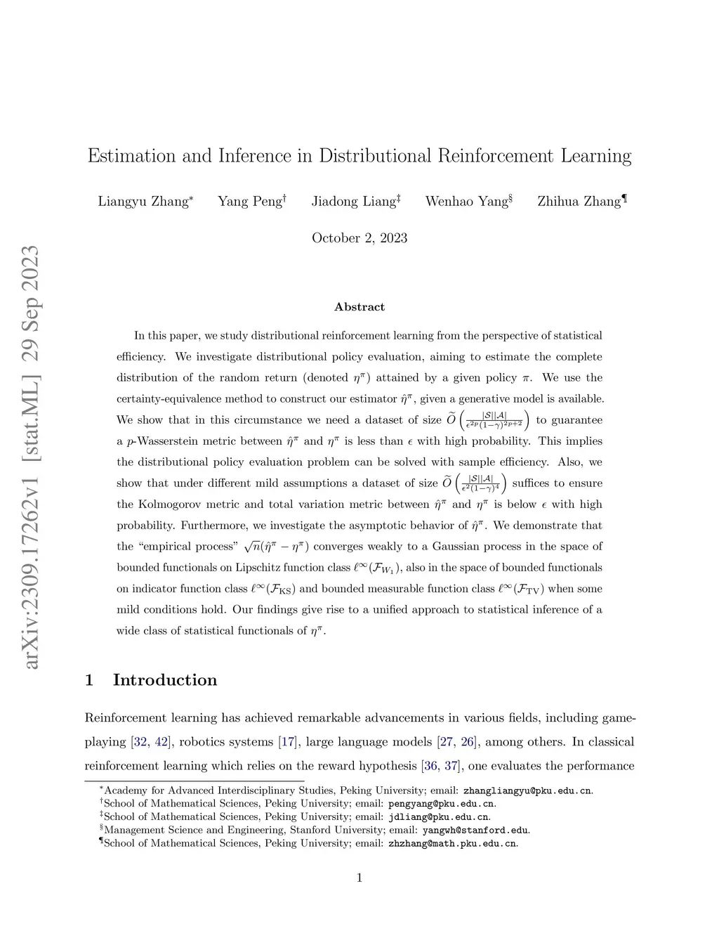 In this paper, we study distributional reinforcement learning from the perspective of statistical efficiency. We investigate distributional policy evaluation, aiming to estimate the complete distribution of the random return (denoted ) attained by a given policy . We use the certainty-equivalence method to construct our estimator , given a generative model is available. We show that in this circumstance we need a dataset of size to guarantee a -Wasserstein metric between and is less than with high probability. This implies the distributional policy evaluation problem can be solved with sample efficiency. Also, we show that under different mild assumptions a dataset of size suffices to ensure the Kolmogorov metric and total variation metric between and is below with high probability. Furthermore, we investigate the asymptotic behavior of . We demonstrate that the ``empirical process'' converges weakly to a Gaussian process in the space of bounded functionals on Lipschitz function class , also in the space of bounded functionals on indicator function class and bounded measurable function class when some mild conditions hold. Our findings give rise to a unified approach to statistical inference of a wide class of statistical functionals of .