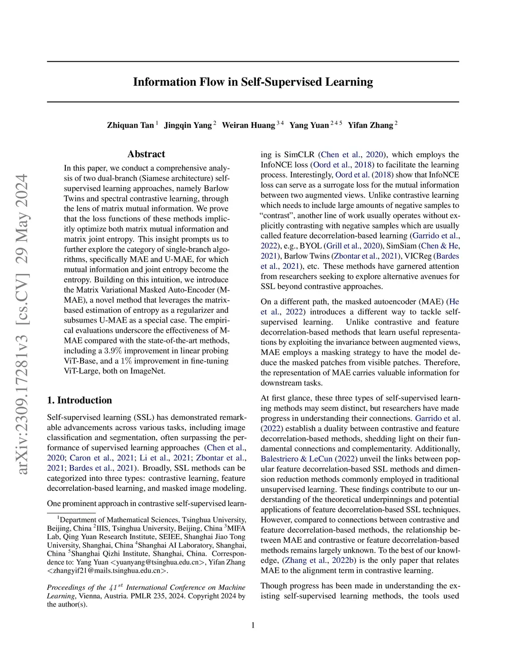 In this paper, we conduct a comprehensive analysis of two dual-branch (Siamese architecture) self-supervised learning approaches, namely Barlow Twins and spectral contrastive learning, through the lens of matrix mutual information. We prove that the loss functions of these methods implicitly optimize both matrix mutual information and matrix joint entropy. This insight prompts us to further explore the category of single-branch algorithms, specifically MAE and U-MAE, for which mutual information and joint entropy become the entropy. Building on this intuition, we introduce the Matrix Variational Masked Auto-Encoder (M-MAE), a novel method that leverages the matrix-based estimation of entropy as a regularizer and subsumes U-MAE as a special case. The empirical evaluations underscore the effectiveness of M-MAE compared with the state-of-the-art methods, including a 3.9% improvement in linear probing ViT-Base, and a 1% improvement in fine-tuning ViT-Large, both on ImageNet.