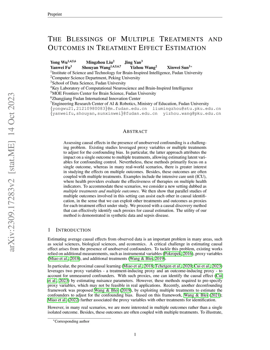 Assessing causal effects in the presence of unobserved confounding is a challenging problem. Existing studies leveraged proxy variables or multiple treatments to adjust for the confounding bias. In particular, the latter approach attributes the impact on a single outcome to multiple treatments, allowing estimating latent variables for confounding control. Nevertheless, these methods primarily focus on a single outcome, whereas in many real-world scenarios, there is greater interest in studying the effects on multiple outcomes. Besides, these outcomes are often coupled with multiple treatments. Examples include the intensive care unit (ICU), where health providers evaluate the effectiveness of therapies on multiple health indicators. To accommodate these scenarios, we consider a new setting dubbed as multiple treatments and multiple outcomes. We then show that parallel studies of multiple outcomes involved in this setting can assist each other in causal identification, in the sense that we can exploit other treatments and outcomes as proxies for each treatment effect under study. We proceed with a causal discovery method that can effectively identify such proxies for causal estimation. The utility of our method is demonstrated in synthetic data and sepsis disease.