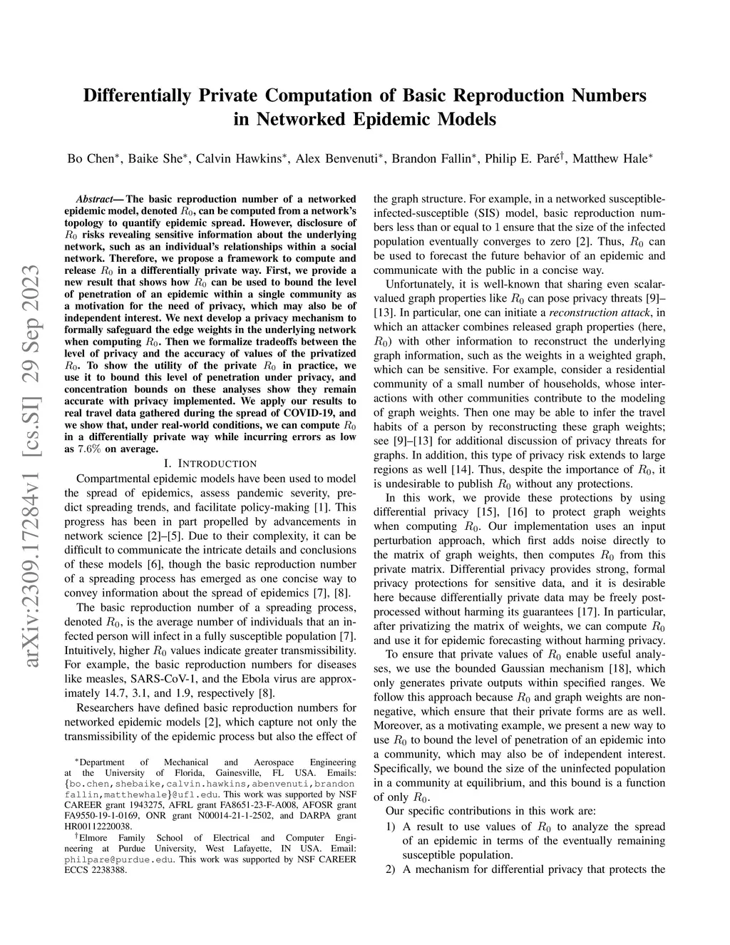 The basic reproduction number of a networked epidemic model, denoted , can be computed from a network's topology to quantify epidemic spread. However, disclosure of risks revealing sensitive information about the underlying network, such as an individual's relationships within a social network. Therefore, we propose a framework to compute and release in a differentially private way. First, we provide a new result that shows how can be used to bound the level of penetration of an epidemic within a single community as a motivation for the need of privacy, which may also be of independent interest. We next develop a privacy mechanism to formally safeguard the edge weights in the underlying network when computing . Then we formalize tradeoffs between the level of privacy and the accuracy of values of the privatized . To show the utility of the private in practice, we use it to bound this level of penetration under privacy, and concentration bounds on these analyses show they remain accurate with privacy implemented. We apply our results to real travel data gathered during the spread of COVID-19, and we show that, under real-world conditions, we can compute in a differentially private way while incurring errors as low as on average.