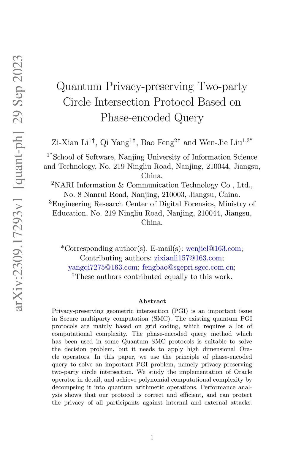 Privacy-preserving geometric intersection (PGI) is an important issue in Secure multiparty computation (SMC). The existing quantum PGI protocols are mainly based on grid coding, which requires a lot of computational complexity. The phase-encoded query method which has been used in some Quantum SMC protocols is suitable to solve the decision problem, but it needs to apply high dimensional Oracle operators. In this paper, we use the principle of phase-encoded query to solve an important PGI problem, namely privacy-preserving two-party circle intersection. We study the implementation of Oracle operator in detail, and achieve polynomial computational complexity by decompsing it into quantum arithmetic operations. Performance analysis shows that our protocol is correct and efficient, and can protect the privacy of all participants against internal and external attacks.