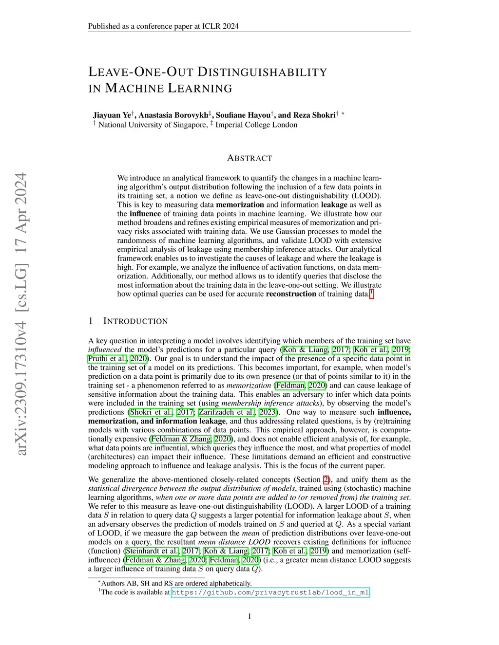 We introduce an analytical framework to quantify the changes in a machine learning algorithm's output distribution following the inclusion of a few data points in its training set, a notion we define as leave-one-out distinguishability (LOOD). This is key to measuring data **memorization** and information **leakage** as well as the **influence** of training data points in machine learning. We illustrate how our method broadens and refines existing empirical measures of memorization and privacy risks associated with training data. We use Gaussian processes to model the randomness of machine learning algorithms, and validate LOOD with extensive empirical analysis of leakage using membership inference attacks. Our analytical framework enables us to investigate the causes of leakage and where the leakage is high. For example, we analyze the influence of activation functions, on data memorization. Additionally, our method allows us to identify queries that disclose the most information about the training data in the leave-one-out setting. We illustrate how optimal queries can be used for accurate **reconstruction** of training data.