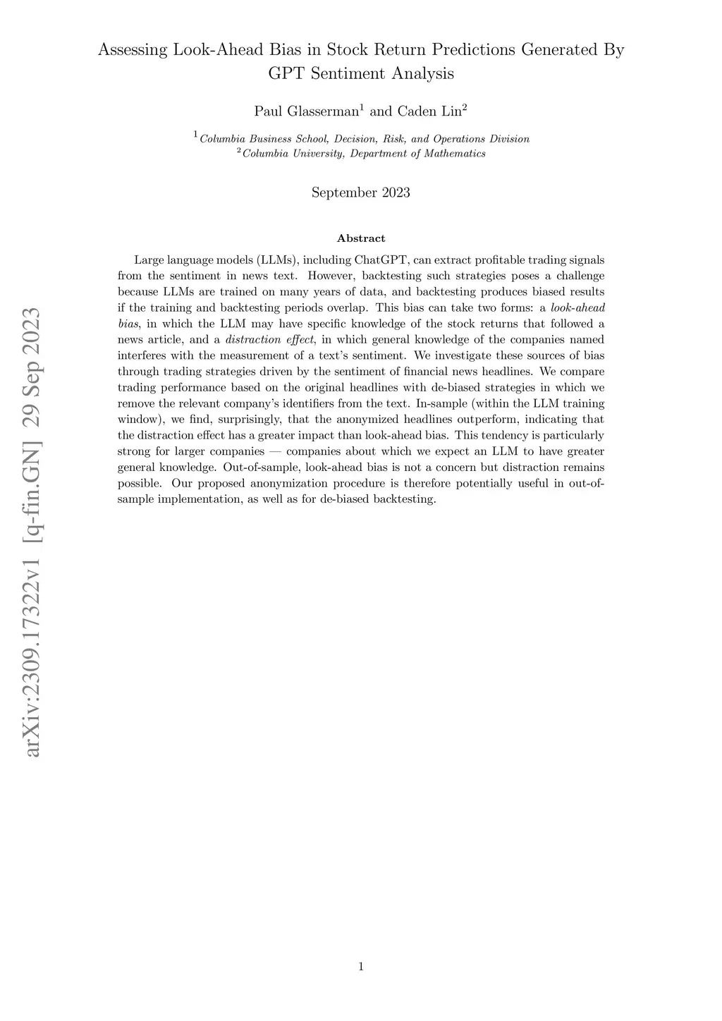 Large language models (LLMs), including ChatGPT, can extract profitable trading signals from the sentiment in news text. However, backtesting such strategies poses a challenge because LLMs are trained on many years of data, and backtesting produces biased results if the training and backtesting periods overlap. This bias can take two forms: a look-ahead bias, in which the LLM may have specific knowledge of the stock returns that followed a news article, and a distraction effect, in which general knowledge of the companies named interferes with the measurement of a text's sentiment. We investigate these sources of bias through trading strategies driven by the sentiment of financial news headlines. We compare trading performance based on the original headlines with de-biased strategies in which we remove the relevant company's identifiers from the text. In-sample (within the LLM training window), we find, surprisingly, that the anonymized headlines outperform, indicating that the distraction effect has a greater impact than look-ahead bias. This tendency is particularly strong for larger companies--companies about which we expect an LLM to have greater general knowledge. Out-of-sample, look-ahead bias is not a concern but distraction remains possible. Our proposed anonymization procedure is therefore potentially useful in out-of-sample implementation, as well as for de-biased backtesting.
