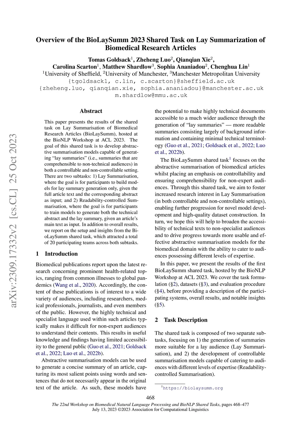 This paper presents the results of the shared task on Lay Summarisation of Biomedical Research Articles (BioLaySumm), hosted at the BioNLP Workshop at ACL 2023. The goal of this shared task is to develop abstractive summarisation models capable of generating "lay summaries" (i.e., summaries that are comprehensible to non-technical audiences) in both a controllable and non-controllable setting. There are two subtasks: 1) Lay Summarisation, where the goal is for participants to build models for lay summary generation only, given the full article text and the corresponding abstract as input; and 2) Readability-controlled Summarisation, where the goal is for participants to train models to generate both the technical abstract and the lay summary, given an article's main text as input. In addition to overall results, we report on the setup and insights from the BioLaySumm shared task, which attracted a total of 20 participating teams across both subtasks.