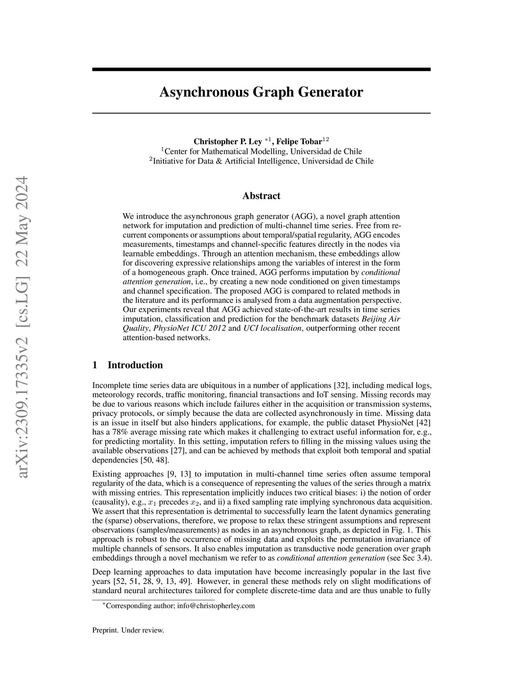 We introduce the asynchronous graph generator (AGG), a novel graph attention network for imputation and prediction of multi-channel time series. Free from recurrent components or assumptions about temporal/spatial regularity, AGG encodes measurements, timestamps and channel-specific features directly in the nodes via learnable embeddings. Through an attention mechanism, these embeddings allow for discovering expressive relationships among the variables of interest in the form of a homogeneous graph. Once trained, AGG performs imputation by \emph{conditional attention generation}, i.e., by creating a new node conditioned on given timestamps and channel specification. The proposed AGG is compared to related methods in the literature and its performance is analysed from a data augmentation perspective. Our experiments reveal that AGG achieved state-of-the-art results in time series imputation, classification and prediction for the benchmark datasets \emph{Beijing Air Quality}, \emph{PhysioNet ICU 2012} and \emph{UCI localisation}, outperforming other recent attention-based networks.