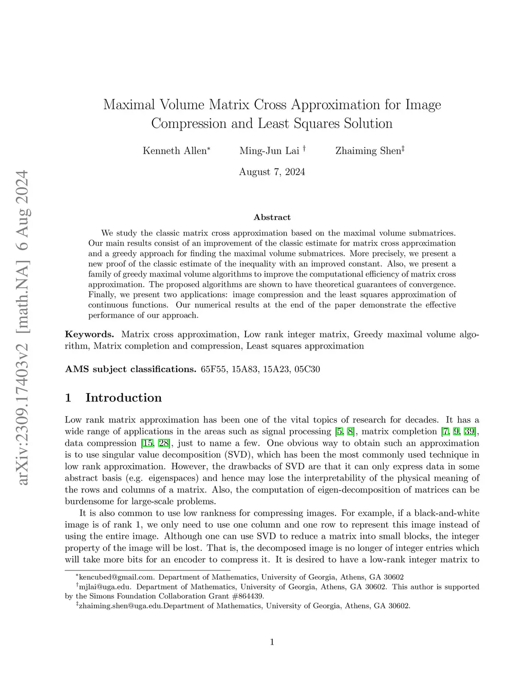 Maximal Volume Matrix Cross Approximation for Image Compression and