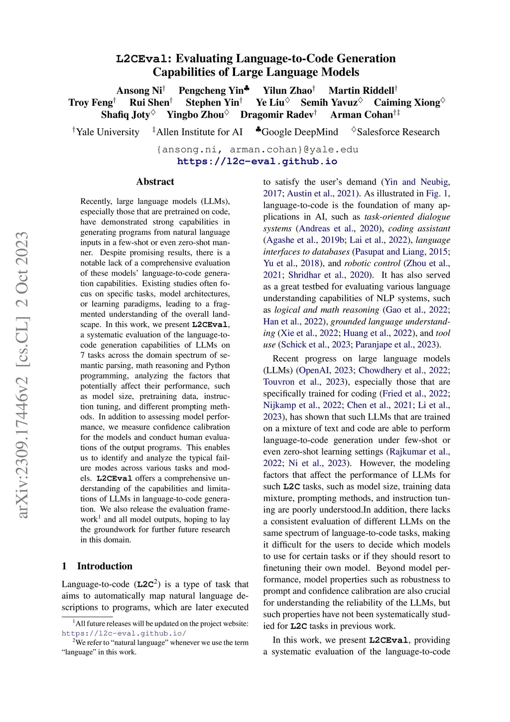 L2CEval: Evaluating Language-to-Code Generation Capabilities of Large Language Models