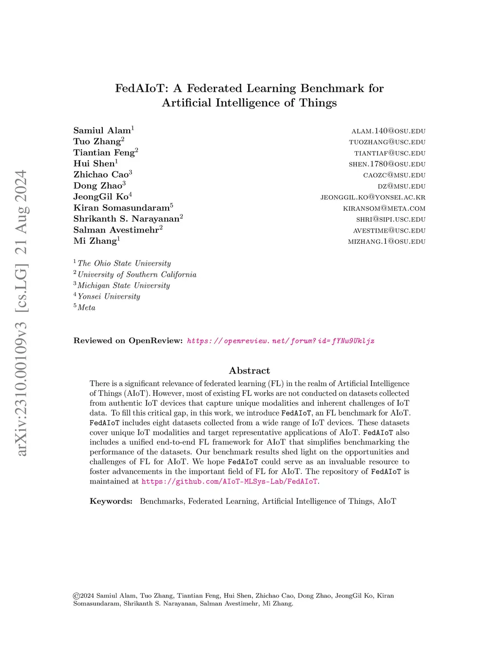 FedAIoT: A Federated Learning Benchmark for Artificial Intelligence of
