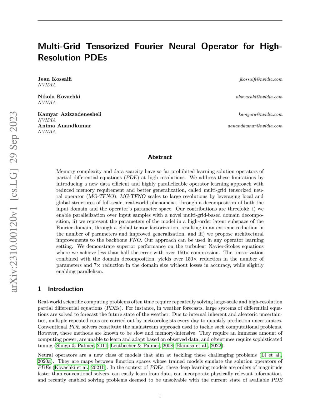 Memory complexity and data scarcity have so far prohibited learning solution operators of partial differential equations (PDEs) at high resolutions. We address these limitations by introducing a new data efficient and highly parallelizable operator learning approach with reduced memory requirement and better generalization, called multi-grid tensorized neural operator (MG-TFNO). MG-TFNO scales to large resolutions by leveraging local and global structures of full-scale, real-world phenomena, through a decomposition of both the input domain and the operator's parameter space. Our contributions are threefold: i) we enable parallelization over input samples with a novel multi-grid-based domain decomposition, ii) we represent the parameters of the model in a high-order latent subspace of the Fourier domain, through a global tensor factorization, resulting in an extreme reduction in the number of parameters and improved generalization, and iii) we propose architectural improvements to the backbone FNO. Our approach can be used in any operator learning setting. We demonstrate superior performance on the turbulent Navier-Stokes equations where we achieve less than half the error with over 150x compression. The tensorization combined with the domain decomposition, yields over 150x reduction in the number of parameters and 7x reduction in the domain size without losses in accuracy, while slightly enabling parallelism.
