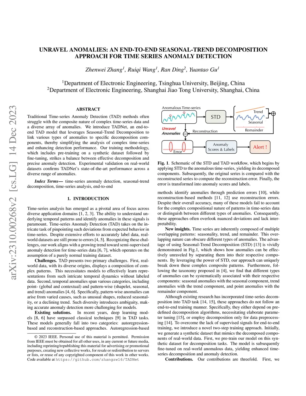 Traditional Time-series Anomaly Detection (TAD) methods often struggle with the composite nature of complex time-series data and a diverse array of anomalies. We introduce TADNet, an end-to-end TAD model that leverages Seasonal-Trend Decomposition to link various types of anomalies to specific decomposition components, thereby simplifying the analysis of complex time-series and enhancing detection performance. Our training methodology, which includes pre-training on a synthetic dataset followed by fine-tuning, strikes a balance between effective decomposition and precise anomaly detection. Experimental validation on real-world datasets confirms TADNet's state-of-the-art performance across a diverse range of anomalies.