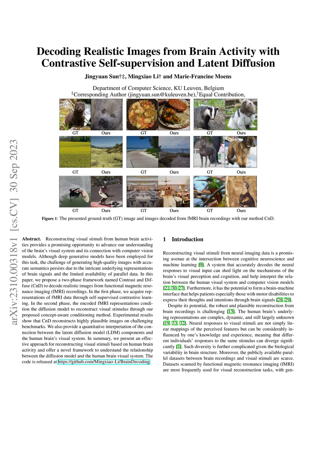 Reconstructing visual stimuli from human brain activities provides a promising opportunity to advance our understanding of the brain's visual system and its connection with computer vision models. Although deep generative models have been employed for this task, the challenge of generating high-quality images with accurate semantics persists due to the intricate underlying representations of brain signals and the limited availability of parallel data. In this paper, we propose a two-phase framework named Contrast and Diffuse (CnD) to decode realistic images from functional magnetic resonance imaging (fMRI) recordings. In the first phase, we acquire representations of fMRI data through self-supervised contrastive learning. In the second phase, the encoded fMRI representations condition the diffusion model to reconstruct visual stimulus through our proposed concept-aware conditioning method. Experimental results show that CnD reconstructs highly plausible images on challenging benchmarks. We also provide a quantitative interpretation of the connection between the latent diffusion model (LDM) components and the human brain's visual system. In summary, we present an effective approach for reconstructing visual stimuli based on human brain activity and offer a novel framework to understand the relationship between the diffusion model and the human brain visual system.