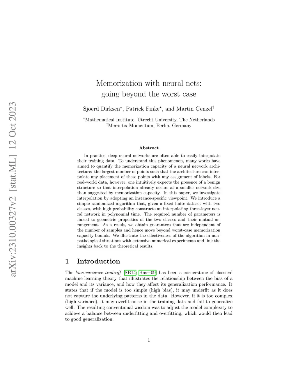 In practice, deep neural networks are often able to easily interpolate their training data. To understand this phenomenon, many works have aimed to quantify the memorization capacity of a neural network architecture: the largest number of points such that the architecture can interpolate any placement of these points with any assignment of labels. For real-world data, however, one intuitively expects the presence of a benign structure so that interpolation already occurs at a smaller network size than suggested by memorization capacity. In this paper, we investigate interpolation by adopting an instance-specific viewpoint. We introduce a simple randomized algorithm that, given a fixed finite dataset with two classes, with high probability constructs an interpolating three-layer neural network in polynomial time. The required number of parameters is linked to geometric properties of the two classes and their mutual arrangement. As a result, we obtain guarantees that are independent of the number of samples and hence move beyond worst-case memorization capacity bounds. We illustrate the effectiveness of the algorithm in non-pathological situations with extensive numerical experiments and link the insights back to the theoretical results.