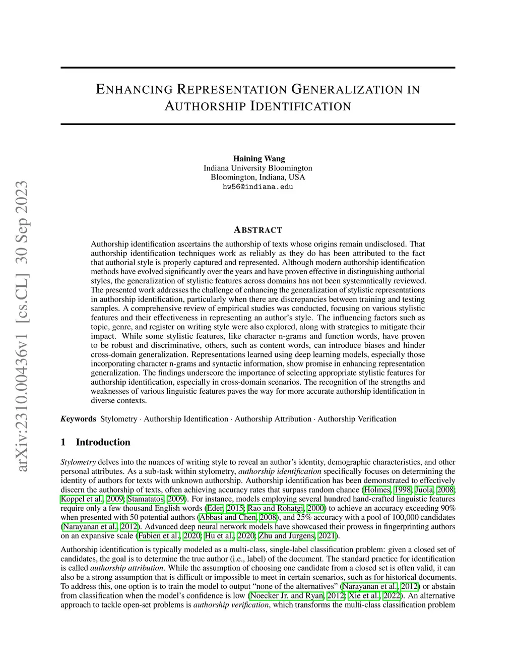 Authorship identification ascertains the authorship of texts whose origins remain undisclosed. That authorship identification techniques work as reliably as they do has been attributed to the fact that authorial style is properly captured and represented. Although modern authorship identification methods have evolved significantly over the years and have proven effective in distinguishing authorial styles, the generalization of stylistic features across domains has not been systematically reviewed. The presented work addresses the challenge of enhancing the generalization of stylistic representations in authorship identification, particularly when there are discrepancies between training and testing samples. A comprehensive review of empirical studies was conducted, focusing on various stylistic features and their effectiveness in representing an author's style. The influencing factors such as topic, genre, and register on writing style were also explored, along with strategies to mitigate their impact. While some stylistic features, like character n-grams and function words, have proven to be robust and discriminative, others, such as content words, can introduce biases and hinder cross-domain generalization. Representations learned using deep learning models, especially those incorporating character n-grams and syntactic information, show promise in enhancing representation generalization. The findings underscore the importance of selecting appropriate stylistic features for authorship identification, especially in cross-domain scenarios. The recognition of the strengths and weaknesses of various linguistic features paves the way for more accurate authorship identification in diverse contexts.