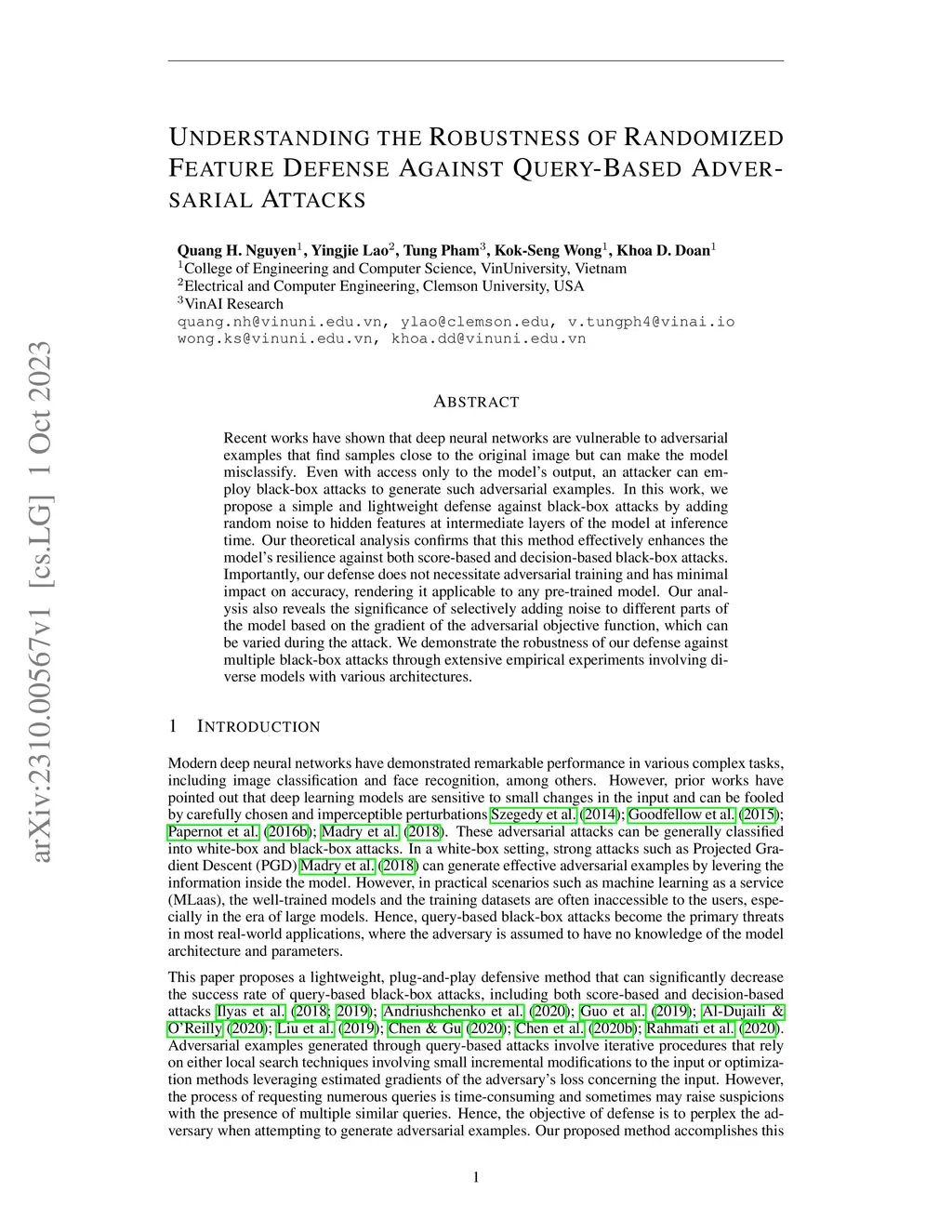 Recent works have shown that deep neural networks are vulnerable to adversarial examples that find samples close to the original image but can make the model misclassify. Even with access only to the model's output, an attacker can employ black-box attacks to generate such adversarial examples. In this work, we propose a simple and lightweight defense against black-box attacks by adding random noise to hidden features at intermediate layers of the model at inference time. Our theoretical analysis confirms that this method effectively enhances the model's resilience against both score-based and decision-based black-box attacks. Importantly, our defense does not necessitate adversarial training and has minimal impact on accuracy, rendering it applicable to any pre-trained model. Our analysis also reveals the significance of selectively adding noise to different parts of the model based on the gradient of the adversarial objective function, which can be varied during the attack. We demonstrate the robustness of our defense against multiple black-box attacks through extensive empirical experiments involving diverse models with various architectures.
