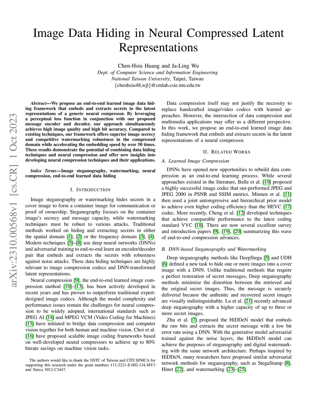 We propose an end-to-end learned image data hiding framework that embeds and extracts secrets in the latent representations of a generic neural compressor. By leveraging a perceptual loss function in conjunction with our proposed message encoder and decoder, our approach simultaneously achieves high image quality and high bit accuracy. Compared to existing techniques, our framework offers superior image secrecy and competitive watermarking robustness in the compressed domain while accelerating the embedding speed by over 50 times. These results demonstrate the potential of combining data hiding techniques and neural compression and offer new insights into developing neural compression techniques and their applications.