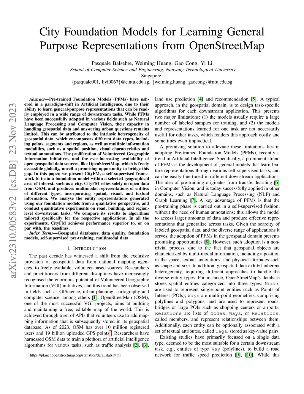 Pre-trained Foundation Models (PFMs) have ushered in a paradigm-shift in Artificial Intelligence, due to their ability to learn general-purpose representations that can be readily employed in a wide range of downstream tasks. While PFMs have been successfully adopted in various fields such as Natural Language Processing and Computer Vision, their capacity in handling geospatial data and answering urban questions remains limited. This can be attributed to the intrinsic heterogeneity of geospatial data, which encompasses different data types, including points, segments and regions, as well as multiple information modalities, such as a spatial position, visual characteristics and textual annotations. The proliferation of Volunteered Geographic Information initiatives, and the ever-increasing availability of open geospatial data sources, like OpenStreetMap, which is freely accessible globally, unveil a promising opportunity to bridge this gap. In this paper, we present CityFM, a self-supervised framework to train a foundation model within a selected geographical area of interest, such as a city. CityFM relies solely on open data from OSM, and produces multimodal representations of entities of different types, incorporating spatial, visual, and textual information. We analyse the entity representations generated using our foundation models from a qualitative perspective, and conduct quantitative experiments on road, building, and region-level downstream tasks. We compare its results to algorithms tailored specifically for the respective applications. In all the experiments, CityFM achieves performance superior to, or on par with, the baselines.