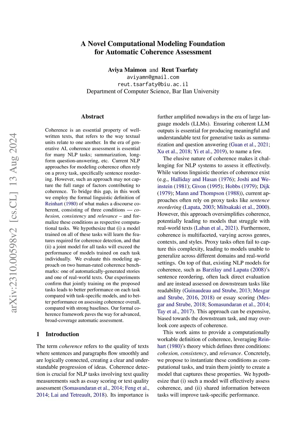 Coherence is an essential property of well-written texts, that refers to the way textual units relate to one another. In the era of generative AI, coherence assessment is essential for many NLP tasks; summarization, generation, long-form question-answering, and more. However, in NLP {coherence} is an ill-defined notion, not having a formal definition or evaluation metrics, that would allow for large-scale automatic and systematic coherence assessment. To bridge this gap, in this work we employ the formal linguistic definition of \citet{Reinhart:1980} of what makes a discourse coherent, consisting of three conditions -- {\em cohesion, consistency} and {\em relevance} -- and formalize these conditions as respective computational tasks. We hypothesize that (i) a model trained on all of these tasks will learn the features required for coherence detection, and that (ii) a joint model for all tasks will exceed the performance of models trained on each task individually. On two benchmarks for coherence scoring rated by humans, one containing 500 automatically-generated short stories and another containing 4k real-world texts, our experiments confirm that jointly training on the proposed tasks leads to better performance on each task compared with task-specific models, and to better performance on assessing coherence overall, compared with strong baselines. We conclude that the formal and computational setup of coherence as proposed here provides a solid foundation for advanced methods of large-scale automatic assessment of coherence.