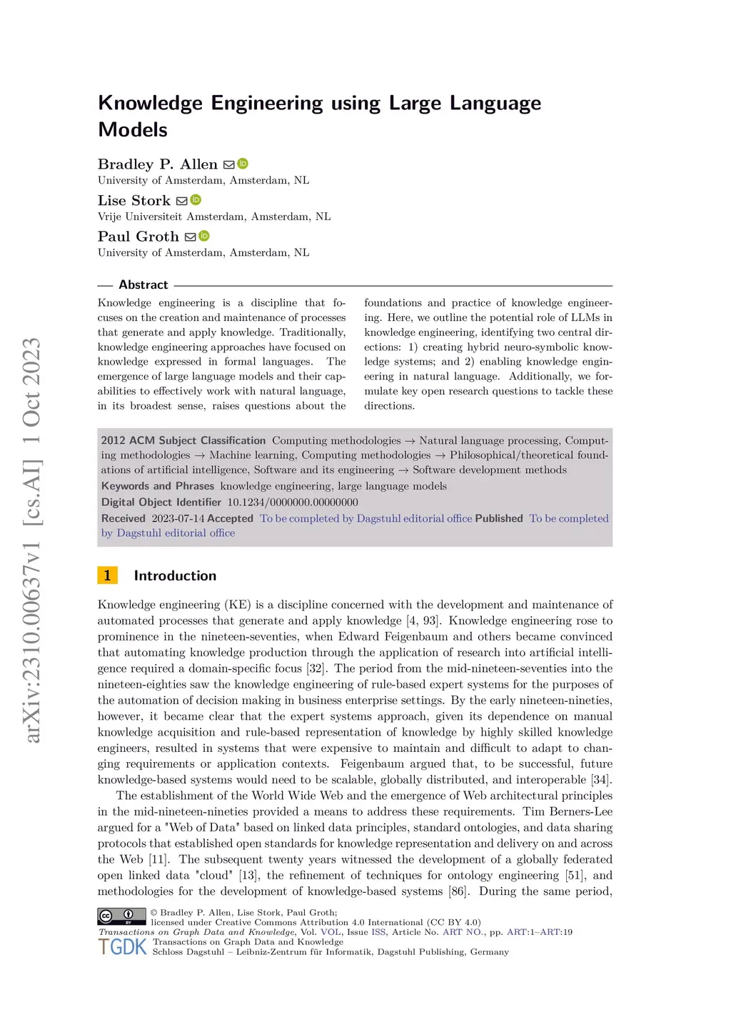 Knowledge engineering is a discipline that focuses on the creation and maintenance of processes that generate and apply knowledge. Traditionally, knowledge engineering approaches have focused on knowledge expressed in formal languages. The emergence of large language models and their capabilities to effectively work with natural language, in its broadest sense, raises questions about the foundations and practice of knowledge engineering. Here, we outline the potential role of LLMs in knowledge engineering, identifying two central directions: 1) creating hybrid neuro-symbolic knowledge systems; and 2) enabling knowledge engineering in natural language. Additionally, we formulate key open research questions to tackle these directions.