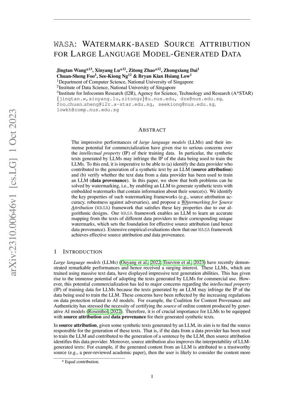 The impressive performances of large language models (LLMs) and their immense potential for commercialization have given rise to serious concerns over the intellectual property (IP) of their training data. In particular, the synthetic texts generated by LLMs may infringe the IP of the data being used to train the LLMs. To this end, it is imperative to be able to (a) identify the data provider who contributed to the generation of a synthetic text by an LLM (source attribution) and (b) verify whether the text data from a data provider has been used to train an LLM (data provenance). In this paper, we show that both problems can be solved by watermarking, i.e., by enabling an LLM to generate synthetic texts with embedded watermarks that contain information about their source(s). We identify the key properties of such watermarking frameworks (e.g., source attribution accuracy, robustness against adversaries), and propose a WAtermarking for Source Attribution (WASA) framework that satisfies these key properties due to our algorithmic designs. Our WASA framework enables an LLM to learn an accurate mapping from the texts of different data providers to their corresponding unique watermarks, which sets the foundation for effective source attribution (and hence data provenance). Extensive empirical evaluations show that our WASA framework achieves effective source attribution and data provenance.