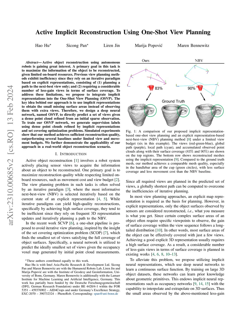Active object reconstruction using autonomous robots is gaining great interest. A primary goal in this task is to maximize the information of the object to be reconstructed, given limited on-board resources. Previous view planning methods exhibit inefficiency since they rely on an iterative paradigm based on explicit representations, consisting of (1) planning a path to the next-best view only; and (2) requiring a considerable number of less-gain views in terms of surface coverage. To address these limitations, we propose to integrate implicit representations into the One-Shot View Planning (OSVP). The key idea behind our approach is to use implicit representations to obtain the small missing surface areas instead of observing them with extra views. Therefore, we design a deep neural network, named OSVP, to directly predict a set of views given a dense point cloud refined from an initial sparse observation. To train our OSVP network, we generate supervision labels using dense point clouds refined by implicit representations and set covering optimization problems. Simulated experiments show that our method achieves sufficient reconstruction quality, outperforming several baselines under limited view and movement budgets. We further demonstrate the applicability of our approach in a real-world object reconstruction scenario.