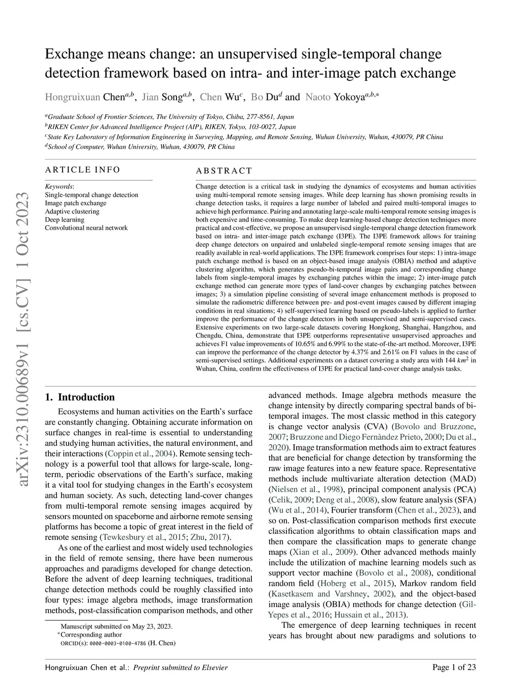 Change detection (CD) is a critical task in studying the dynamics of ecosystems and human activities using multi-temporal remote sensing images. While deep learning has shown promising results in CD tasks, it requires a large number of labeled and paired multi-temporal images to achieve high performance. Pairing and annotating large-scale multi-temporal remote sensing images is both expensive and time-consuming. To make deep learning-based CD techniques more practical and cost-effective, we propose an unsupervised single-temporal CD framework based on intra- and inter-image patch exchange (I3PE). The I3PE framework allows for training deep change detectors on unpaired and unlabeled single-temporal remote sensing images that are readily available in real-world applications. The I3PE framework comprises four steps: 1) intra-image patch exchange method is based on an object-based image analysis method and adaptive clustering algorithm, which generates pseudo-bi-temporal image pairs and corresponding change labels from single-temporal images by exchanging patches within the image; 2) inter-image patch exchange method can generate more types of land-cover changes by exchanging patches between images; 3) a simulation pipeline consisting of several image enhancement methods is proposed to simulate the radiometric difference between pre- and post-event images caused by different imaging conditions in real situations; 4) self-supervised learning based on pseudo-labels is applied to further improve the performance of the change detectors in both unsupervised and semi-supervised cases. Extensive experiments on two large-scale datasets demonstrate that I3PE outperforms representative unsupervised approaches and achieves F1 value improvements of 10.65% and 6.99% to the SOTA method. Moreover, I3PE can improve the performance of the ... (see the original article for full abstract)