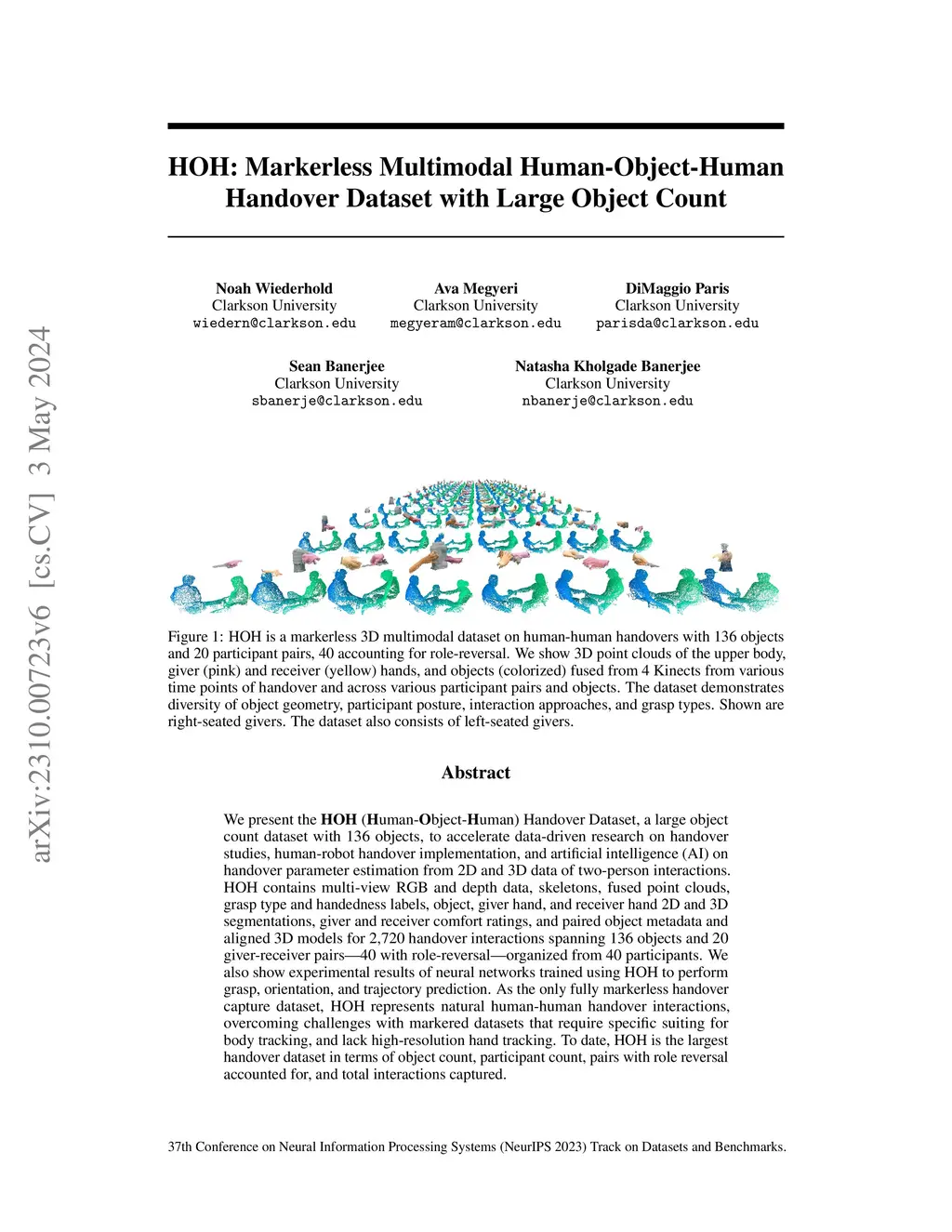 We present the HOH (Human-Object-Human) Handover Dataset, a large object count dataset with 136 objects, to accelerate data-driven research on handover studies, human-robot handover implementation, and artificial intelligence (AI) on handover parameter estimation from 2D and 3D data of person interactions. HOH contains multi-view RGB and depth data, skeletons, fused point clouds, grasp type and handedness labels, object, giver hand, and receiver hand 2D and 3D segmentations, giver and receiver comfort ratings, and paired object metadata and aligned 3D models for 2,720 handover interactions spanning 136 objects and 20 giver-receiver pairs-40 with role-reversal-organized from 40 participants. We also show experimental results of neural networks trained using HOH to perform grasp, orientation, and trajectory prediction. As the only fully markerless handover capture dataset, HOH represents natural human-human handover interactions, overcoming challenges with markered datasets that require specific suiting for body tracking, and lack high-resolution hand tracking. To date, HOH is the largest handover dataset in number of objects, participants, pairs with role reversal accounted for, and total interactions captured.