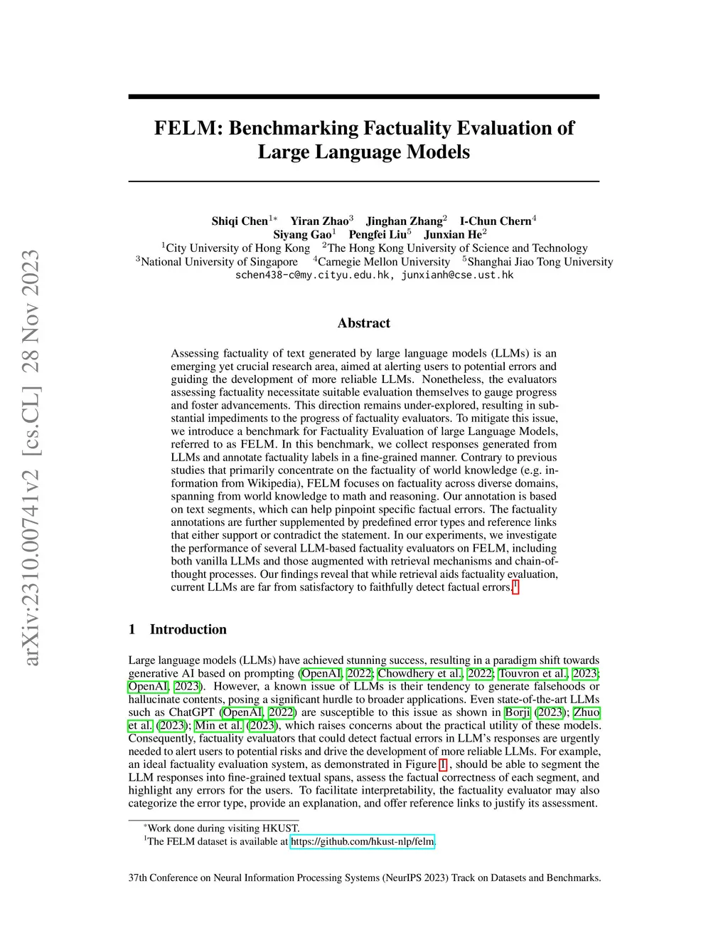 FELM: Benchmarking Factuality Evaluation of Large Language Models