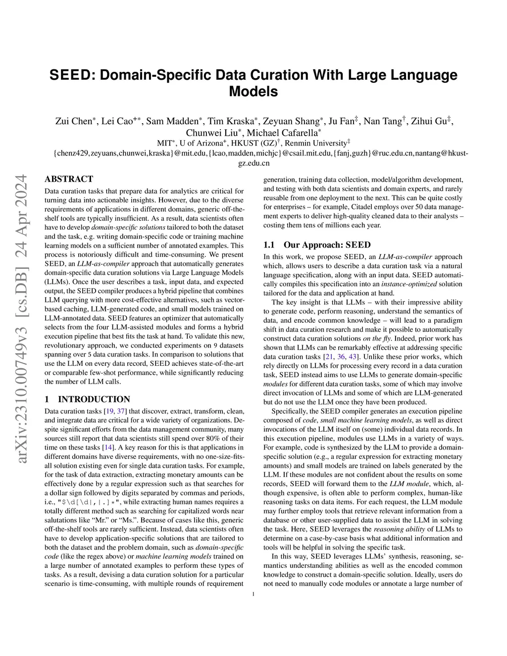Data curation tasks that prepare data for analytics are critical for turning data into actionable insights. However, due to the diverse requirements of applications in different domains, generic off-the-shelf tools are typically insufficient. As a result, data scientists often have to develop domain-specific solutions tailored to both the dataset and the task, e.g. writing domain-specific code or training machine learning models on a sufficient number of annotated examples. This process is notoriously difficult and time-consuming. We present SEED, an LLM-as-compiler approach that automatically generates domain-specific data curation solutions via Large Language Models (LLMs). Once the user describes a task, input data, and expected output, the SEED compiler produces a hybrid pipeline that combines LLM querying with more cost-effective alternatives, such as vector-based caching, LLM-generated code, and small models trained on LLM-annotated data. SEED features an optimizer that automatically selects from the four LLM-assisted modules and forms a hybrid execution pipeline that best fits the task at hand. To validate this new, revolutionary approach, we conducted experiments on datasets spanning over data curation tasks. In comparison to solutions that use the LLM on every data record, SEED achieves state-of-the-art or comparable few-shot performance, while significantly reducing the number of LLM calls.