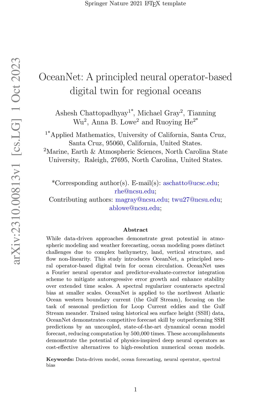 While data-driven approaches demonstrate great potential in atmospheric modeling and weather forecasting, ocean modeling poses distinct challenges due to complex bathymetry, land, vertical structure, and flow non-linearity. This study introduces OceanNet, a principled neural operator-based digital twin for ocean circulation. OceanNet uses a Fourier neural operator and predictor-evaluate-corrector integration scheme to mitigate autoregressive error growth and enhance stability over extended time scales. A spectral regularizer counteracts spectral bias at smaller scales. OceanNet is applied to the northwest Atlantic Ocean western boundary current (the Gulf Stream), focusing on the task of seasonal prediction for Loop Current eddies and the Gulf Stream meander. Trained using historical sea surface height (SSH) data, OceanNet demonstrates competitive forecast skill by outperforming SSH predictions by an uncoupled, state-of-the-art dynamical ocean model forecast, reducing computation by 500,000 times. These accomplishments demonstrate the potential of physics-inspired deep neural operators as cost-effective alternatives to high-resolution numerical ocean models.