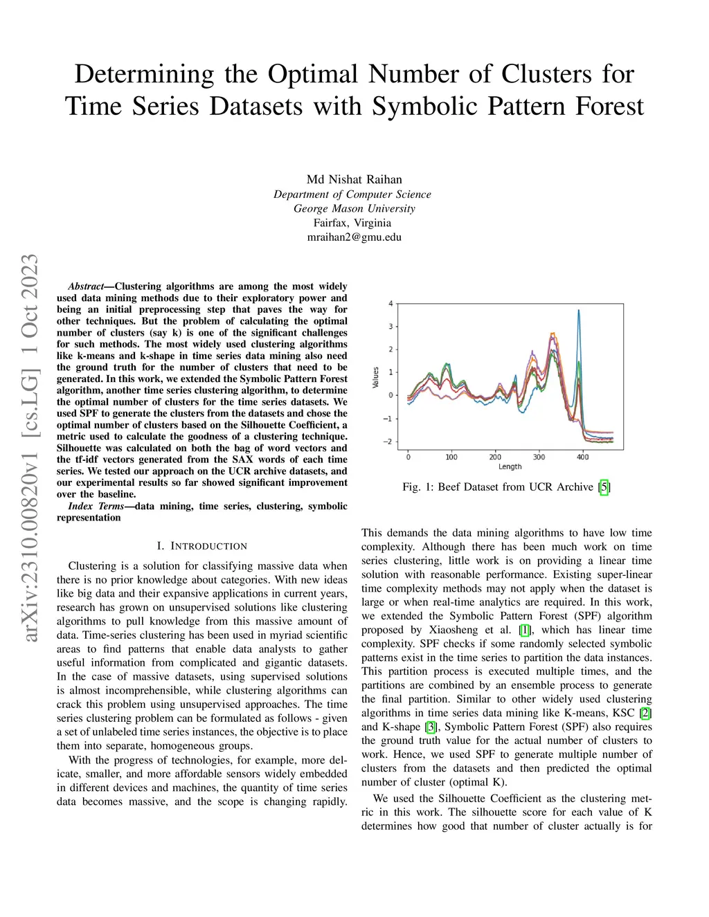Clustering algorithms are among the most widely used data mining methods due to their exploratory power and being an initial preprocessing step that paves the way for other techniques. But the problem of calculating the optimal number of clusters (say k) is one of the significant challenges for such methods. The most widely used clustering algorithms like k-means and k-shape in time series data mining also need the ground truth for the number of clusters that need to be generated. In this work, we extended the Symbolic Pattern Forest algorithm, another time series clustering algorithm, to determine the optimal number of clusters for the time series datasets. We used SPF to generate the clusters from the datasets and chose the optimal number of clusters based on the Silhouette Coefficient, a metric used to calculate the goodness of a clustering technique. Silhouette was calculated on both the bag of word vectors and the tf-idf vectors generated from the SAX words of each time series. We tested our approach on the UCR archive datasets, and our experimental results so far showed significant improvement over the baseline.