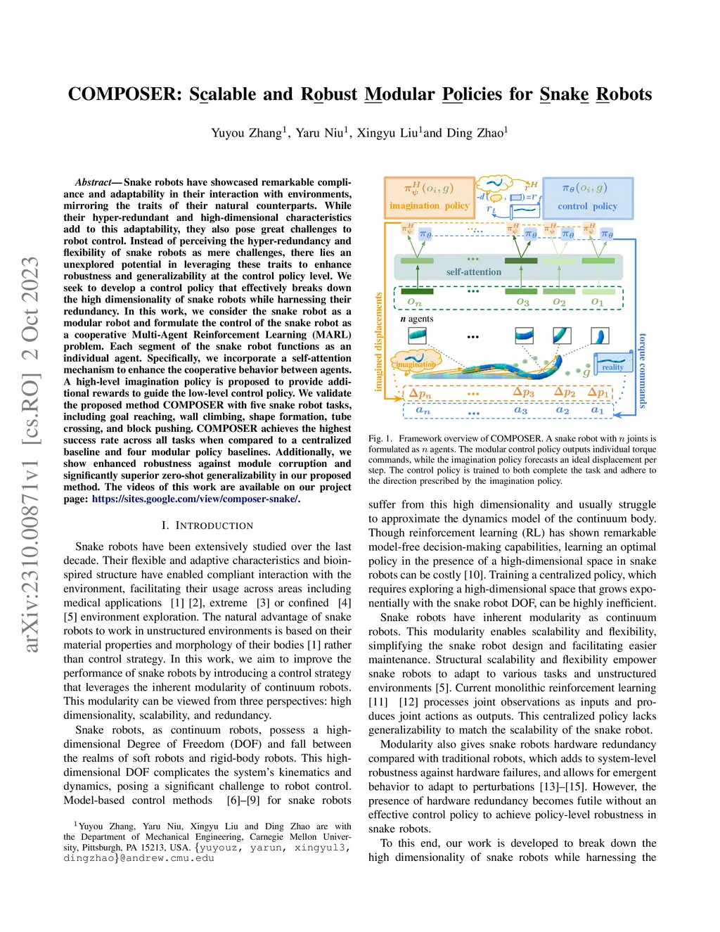 Snake robots have showcased remarkable compliance and adaptability in their interaction with environments, mirroring the traits of their natural counterparts. While their hyper-redundant and high-dimensional characteristics add to this adaptability, they also pose great challenges to robot control. Instead of perceiving the hyper-redundancy and flexibility of snake robots as mere challenges, there lies an unexplored potential in leveraging these traits to enhance robustness and generalizability at the control policy level. We seek to develop a control policy that effectively breaks down the high dimensionality of snake robots while harnessing their redundancy. In this work, we consider the snake robot as a modular robot and formulate the control of the snake robot as a cooperative Multi-Agent Reinforcement Learning (MARL) problem. Each segment of the snake robot functions as an individual agent. Specifically, we incorporate a self-attention mechanism to enhance the cooperative behavior between agents. A high-level imagination policy is proposed to provide additional rewards to guide the low-level control policy. We validate the proposed method COMPOSER with five snake robot tasks, including goal reaching, wall climbing, shape formation, tube crossing, and block pushing. COMPOSER achieves the highest success rate across all tasks when compared to a centralized baseline and four modular policy baselines. Additionally, we show enhanced robustness against module corruption and significantly superior zero-shot generalizability in our proposed method. The videos of this work are available on our project page: https://sites.google.com/view/composer-snake/.