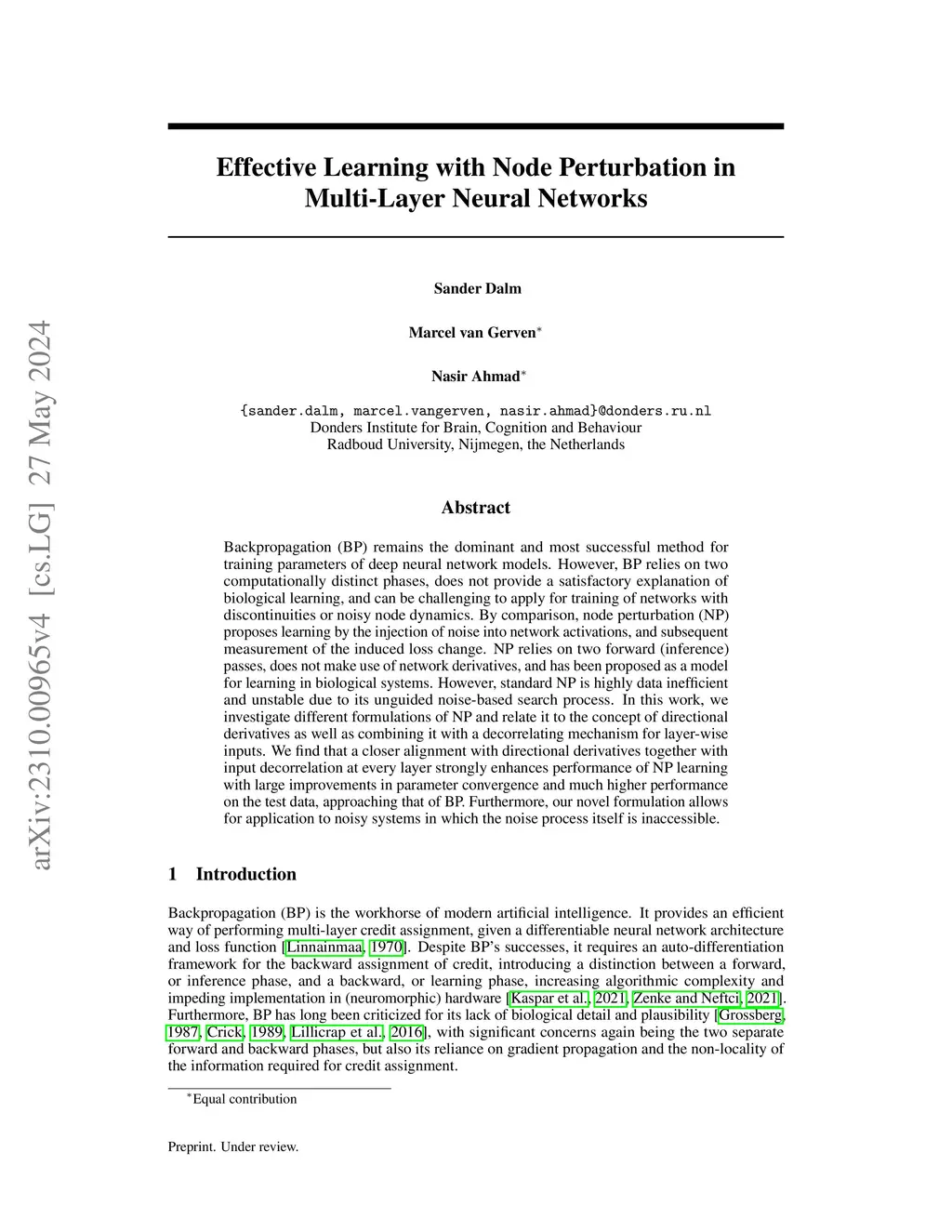 Effective Learning with Node Perturbation in Multi-Layer Neural Networks